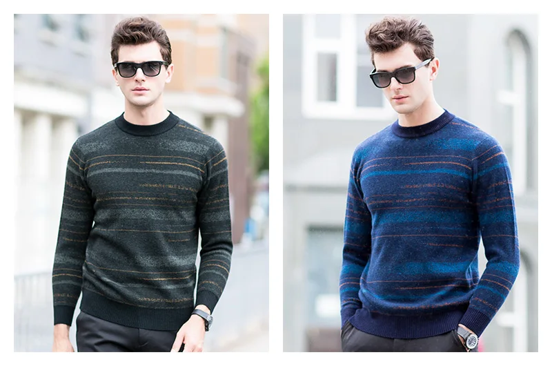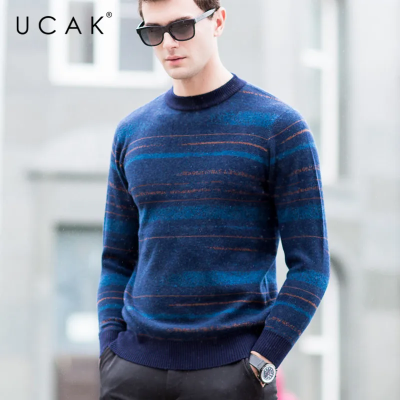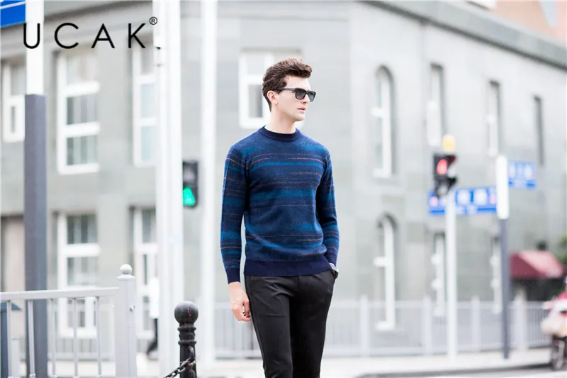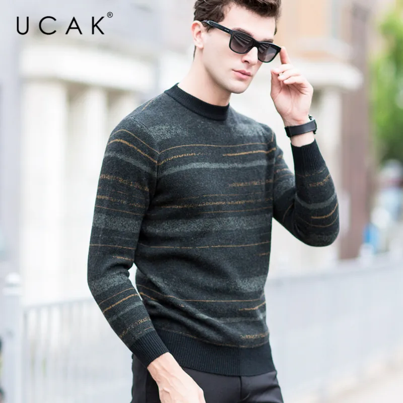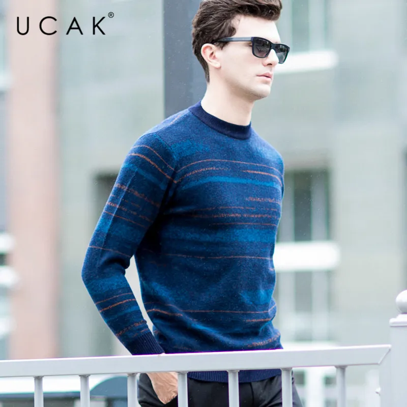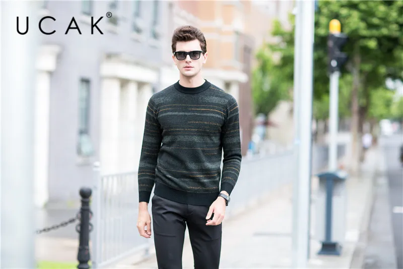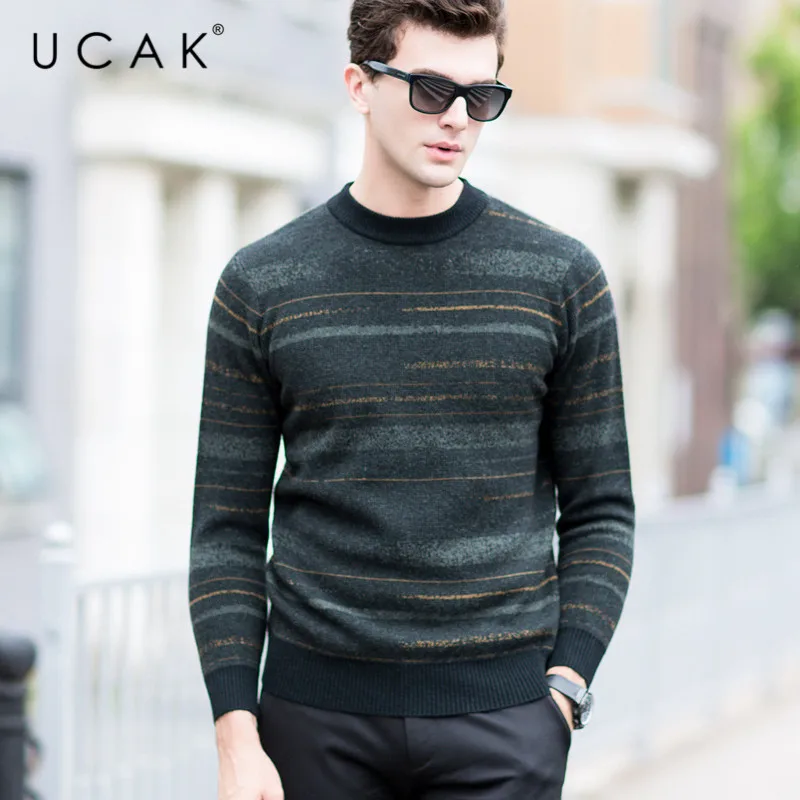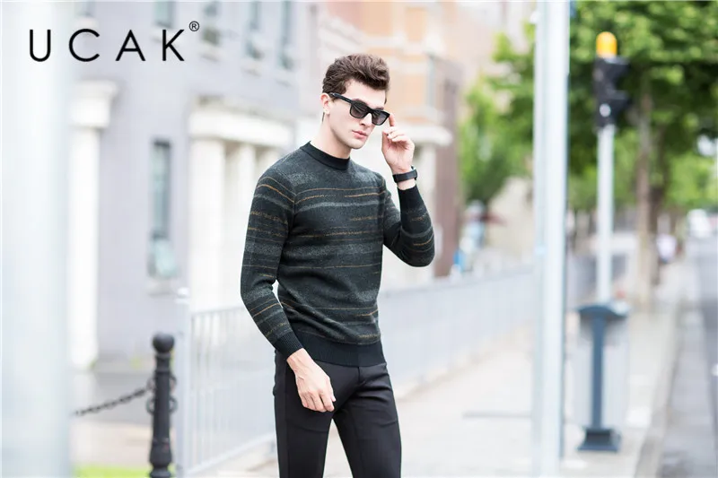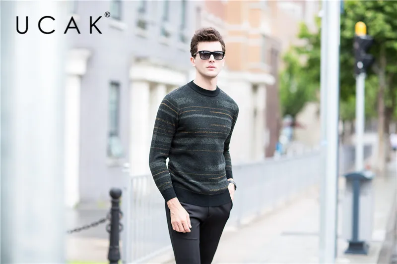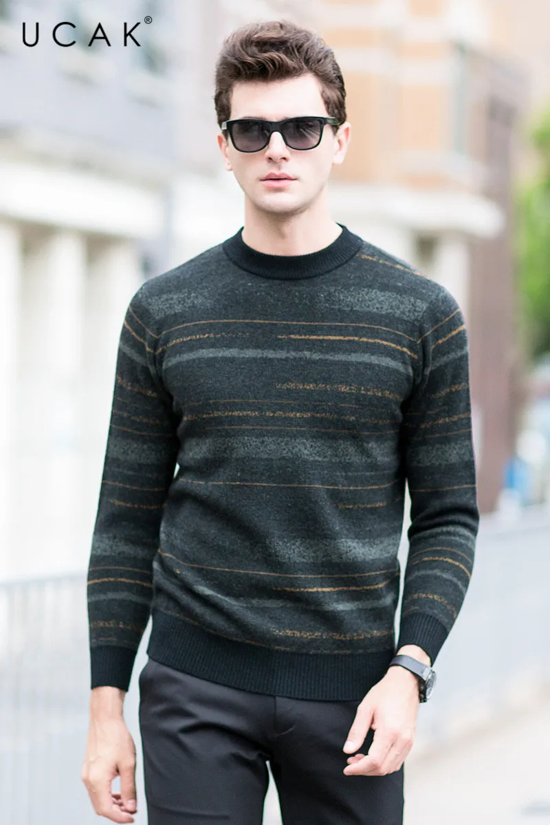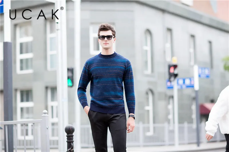 UCAK брендовые Новые свитера мужские модные трендовые повседневные уличные свитера с круглым вырезом из чистой мериносовой шерсти осенне-зимний, теплый, полосатый свитер U3145
