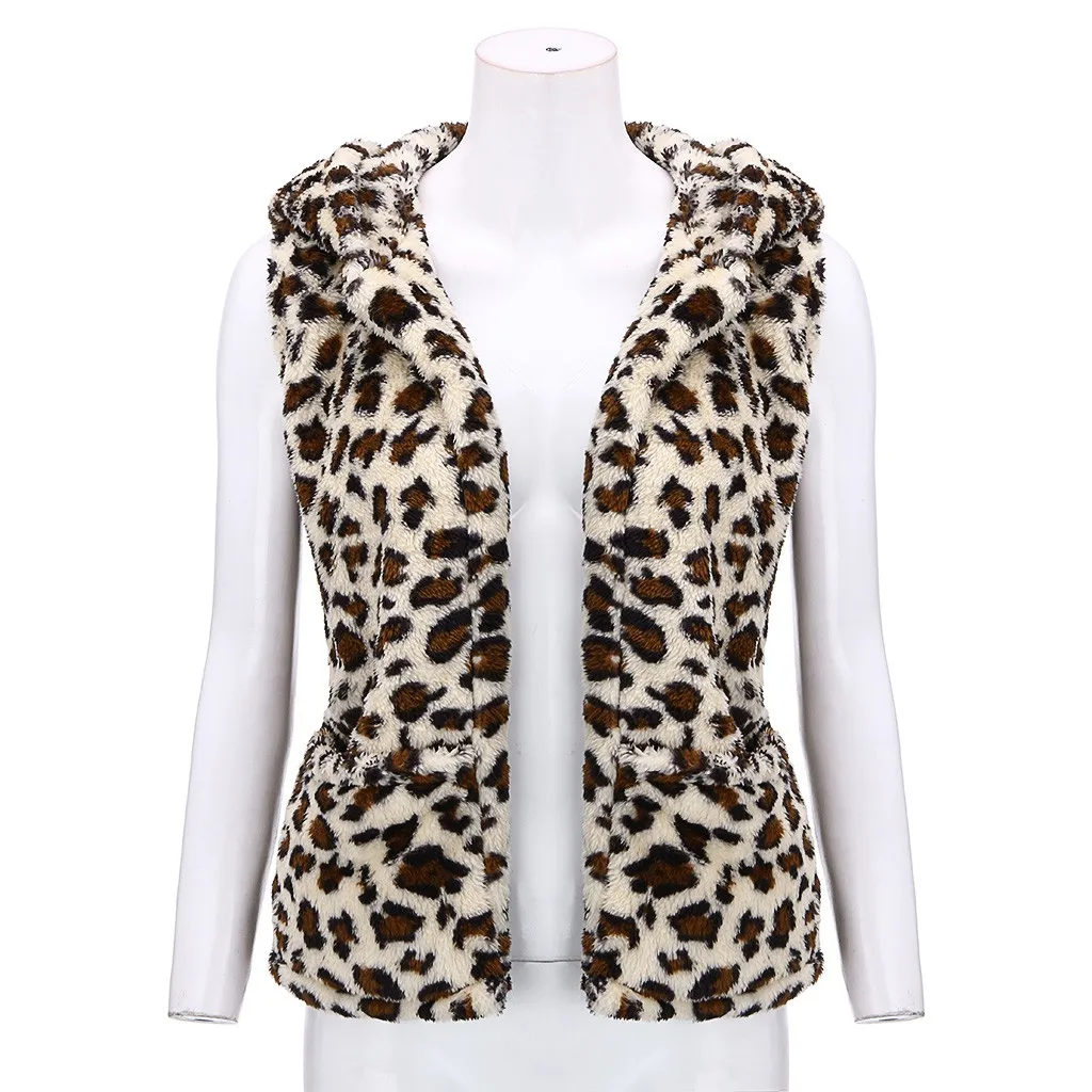 Мода женщин с капюшоном без рукавов леопардовой печати Карманы Теплый искусственный мех жилет Топ