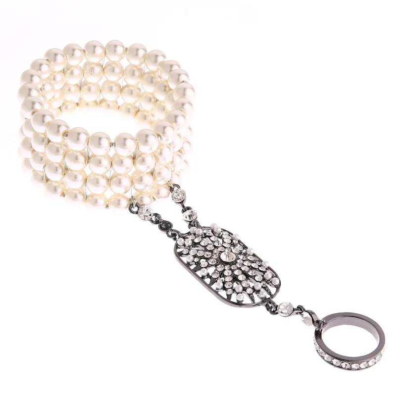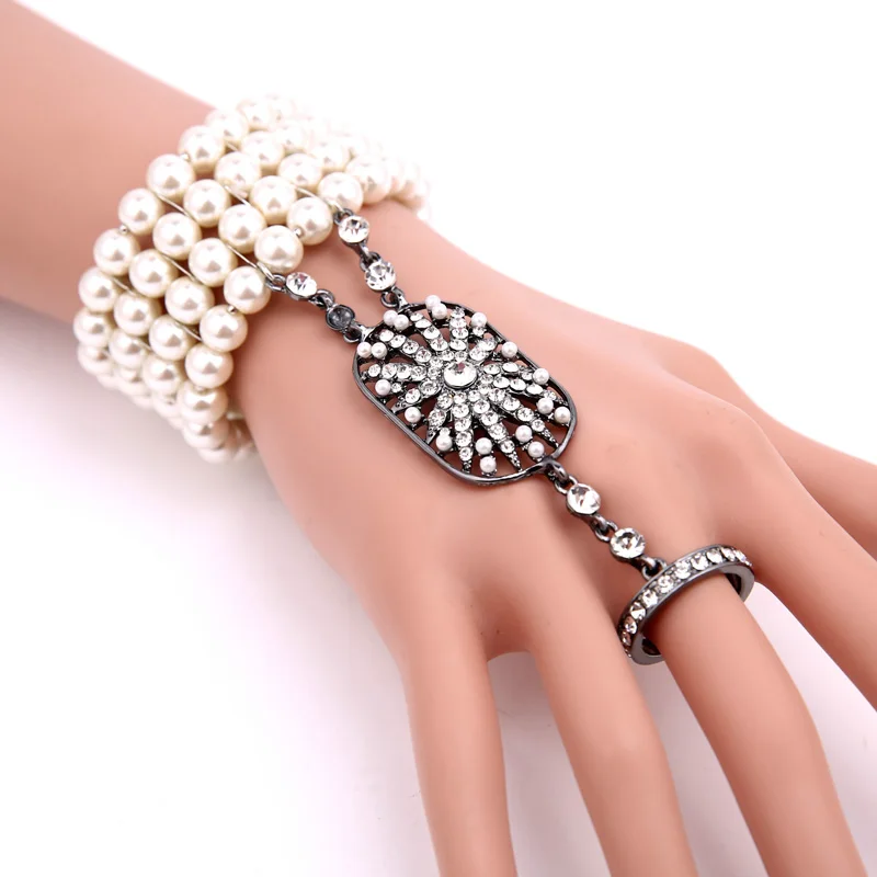 Art Deco The Great Gatsby Inspired Flower Simulated Pearl Bracelet Ring Set ,Wedding Bridal Bracelet .