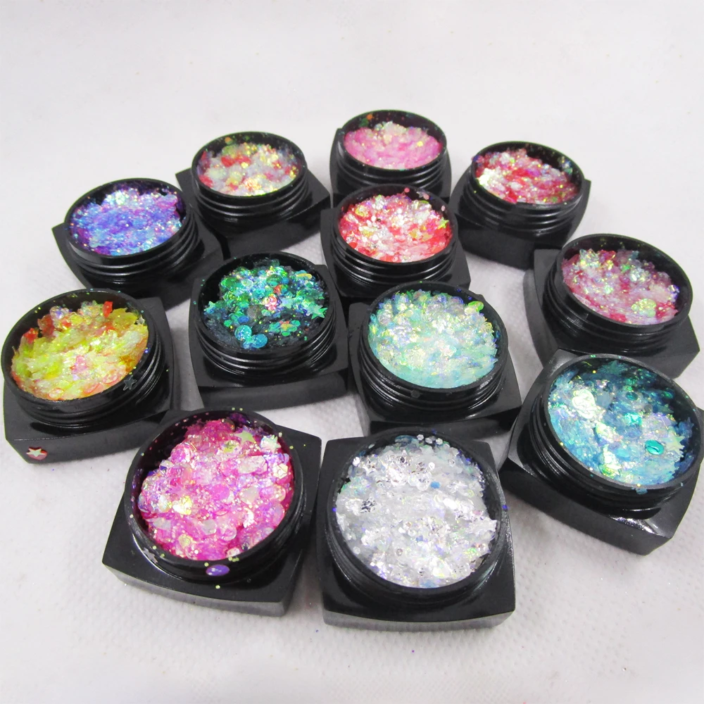 Do not suit for sensitive skin 12 colors: iridescent pink, iridescent green, iridescent red, iridescent white, iridescent yellow, iridescent purple, ect Included star, round disc, heart and fine glitter
