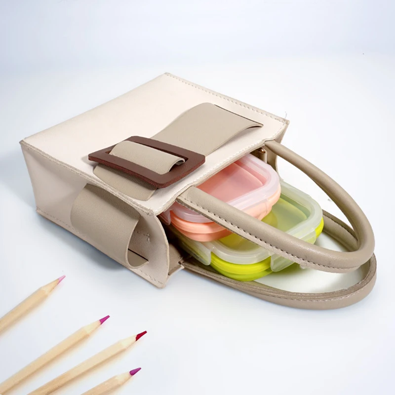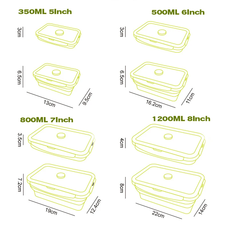 Особенности: Экологически чистый пищевой силиконовый материал, нетоксичный, не вреден для нашего здоровья. Складной дизайн, легко носить с собой и экономить место. Может использоваться в микроволновой печи, холодильнике. Подходит для кухни, улицы, кемпинга, путешествий, пеших прогулок и т. д. Не легко деформируется, разрывается, плавится. Спецификация: Материал: пищевой силикон, экологически чистый ПП Термостойкость: -40-120 градусов по Цельсию Размер: 300 мл: 13x9.5x6.5см 500 мл: 16.2x11x6.5см 800 мл: 19.5x12.4x7.2см 1200 мл: 22x14x8 см Толщина складывания (прибл.): 3-4 см 4 размера, домашний контейнер для еды, портативный прямоугольный силиконовый контейнер для еды Bento, складная Экологически чистая коробка для ланча для кемпинга на открытом воздухе, Прямая поставка