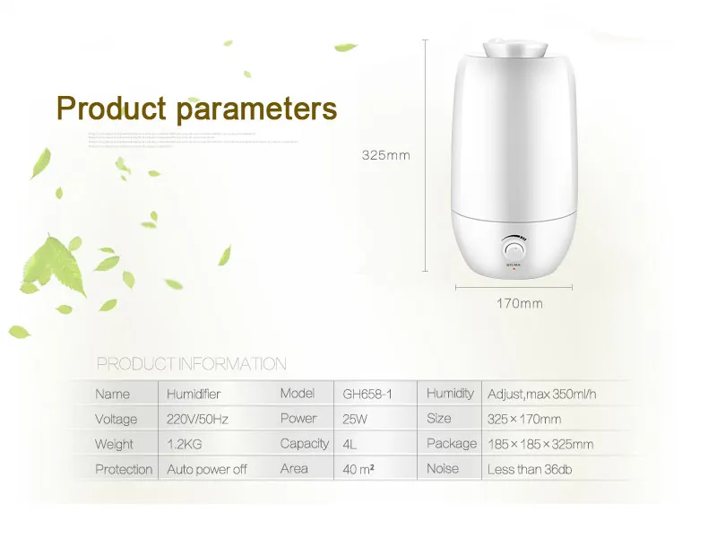 Параметры продукта Наименование: мощность увлажнителя: 25 Вт Напряжение: 220 В/50 Гц Емкость: 4л Вес: 1,2 кг площадь: 40 м² Защита: Автоматическое отключение влажности: регулировка, Макс 350 мл/ч Размер: 325*170 мм посылка: 185*185*325 мм Примечание: менее 36 дБ