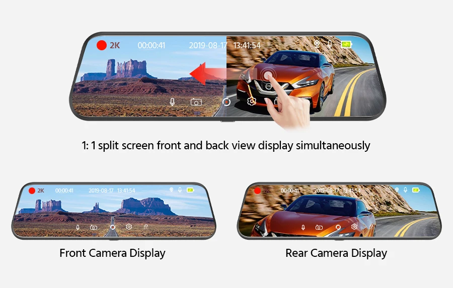 1:1 дизайн разделенного экрана для переключения записи переднего и заднего вида, большого экрана и чёткости и ersily для проверки заднего вида. Вы можете переключать виды, проводя пальцем влево или вправо. Он содержит 3 вида: вид спереди, вид сзади, вид спереди и сзади.