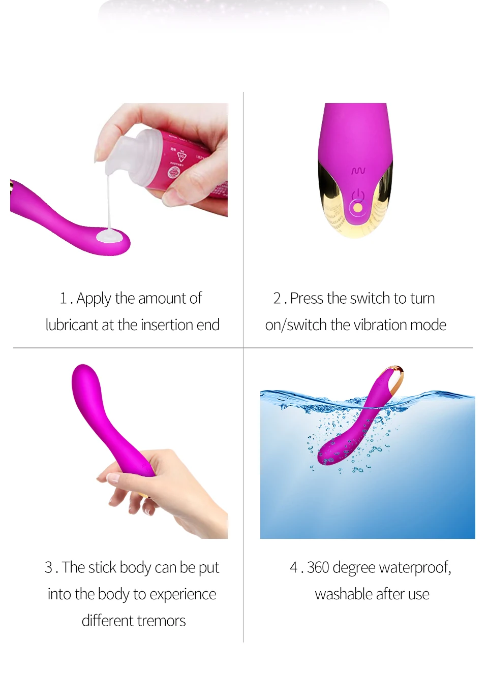 【Рекомендации 】 ❤Вытрите «игрушку» на 75% медицинского спирта или стерилизовать дезинфицирующее средство перед использованием. Нанесите необходимое количество смазки на изделие. Рекомендуется использовать вместе с презервативом; ❤Вставляйте в тело до максимума. 【Precauprecau】 ❤После использования «игрушка» имеет большое количество выделений и смазки. Он будет легко размножаться бактерии, если не очистить его в течение длительного времени. Поэтому, пожалуйста, очистите вашу «игрушку» сразу же после использования. ❤Когда вы чистите «игрушку», пожалуйста, не Разделяйте воду на переключатель и блок питания. Просто протрите пальцами и водой, не используйте щетку или кислотный очиститель. ❤После стирки рекомендуется протереть сухой хлопковой тканью, высококачественная ткань также является хорошим выбором. После протрите воду, высушите естественным образом и избегайте воздействия солнца! ❤Наконец, вы можете использовать специальную чистящую жидкость или разбавленный спирт (75%) для дезинфекции, или вы можете посыпать немного талька для хранения. ❤Вы можете использовать бархатный мешок или мешок для хранения. Храните его в прохладном и сухом месте.