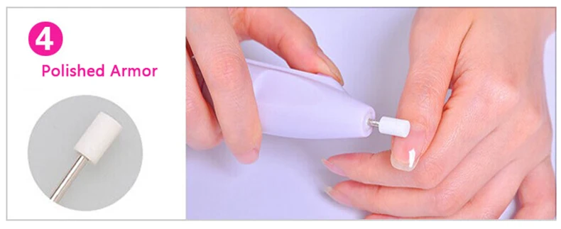 1. Металлическая Полировочная полоса; удалите более жесткую толстую омертвевшую кожу, чтобы сделать кожу аккуратной. 2. Круглая шлифовальная полоса: вы можете полировать поверхность ногтя и использовать его, чтобы выглядеть красиво. 3. Дисковая Шлифовальная головка: после того, как гвоздь вырезан, он разглаживается и разглаживается, чтобы обрезать края. 4. Лак для ногтей: гладьте поверхность ногтей и полируйте неровные области ногтей. 5. Края скрабы головы: ремонт края зазоров, чтобы сделать ногти ровными.