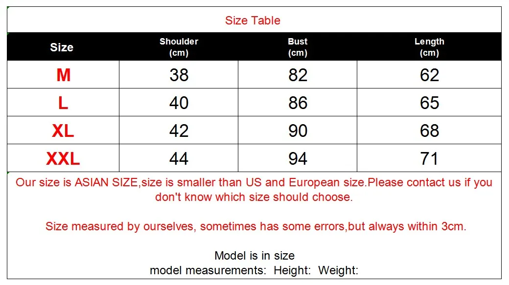 1. Наш размер азиатский, размер меньше, чем американский и европейский. Пожалуйста, свяжитесь с нами, если вы не знаете, какой размер выбрать. Размер, измеренный нами, иногда имеет некоторые ошибки, но всегда в пределах 3 см. 2. Если у вас есть какие-либо другие вопросы, пожалуйста, свяжитесь с нами. 3. Советы: отображение различных компьютеров или мобильных телефонов отличается, пожалуйста, обратитесь к фактическому продукту. 4. Из-за различных партий продукции, иногда материал, разница в цвете и этикетка продукта будут отличаться, но разница не будет слишком большой. Мы надеемся на ваше понимание.