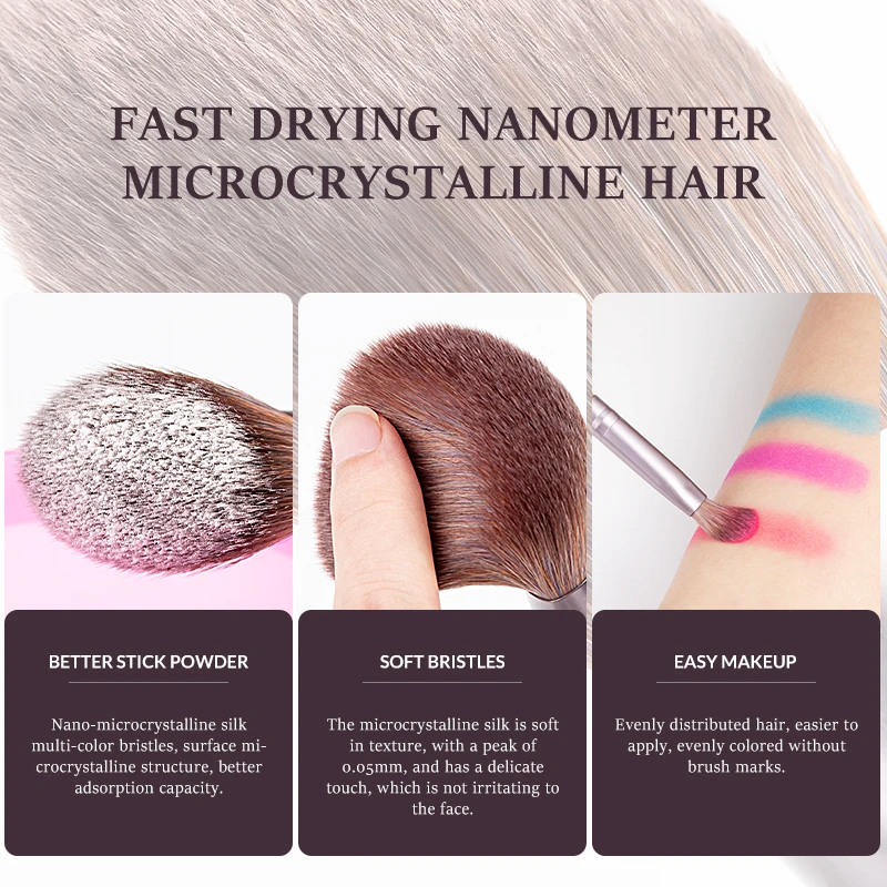Синтетические щетинки, тонкие, крошечные и мягкие. Деревянная ручка, прочная и высококачественная. Алюминиевый ободок, красивый вид.
