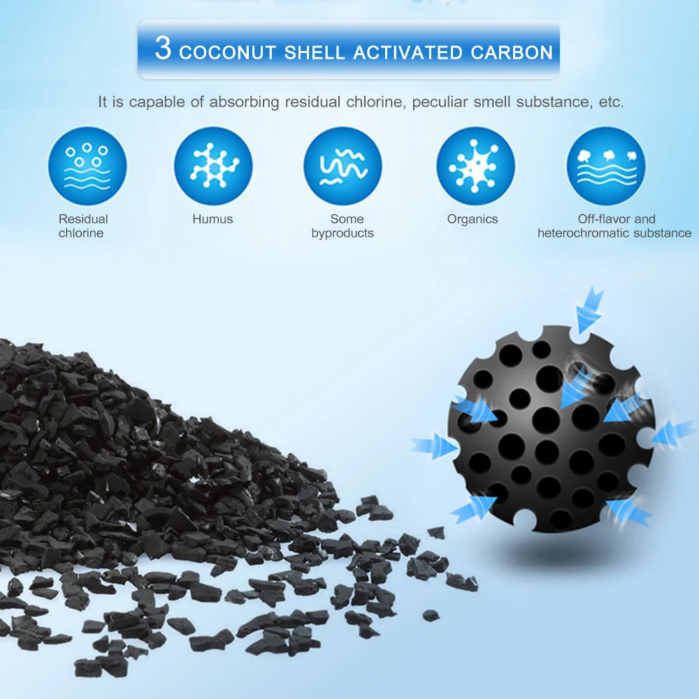 Эффективная фильтрация-- Процесс четырехкратной фильтрации эффективно очищает воду (полипропиленовый хлопковый слой для удержания крупных частиц, таких как песок, ионообменный смоляный фильтр против тяжелых металлов, барьер с активированным углем, предотвращающий прохождение через вредное соединение и органику, И последний тонкий сажевый фильтр).