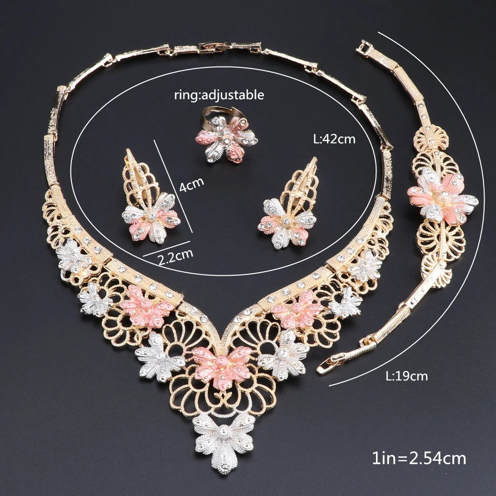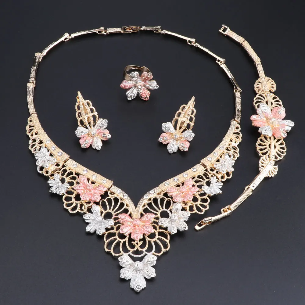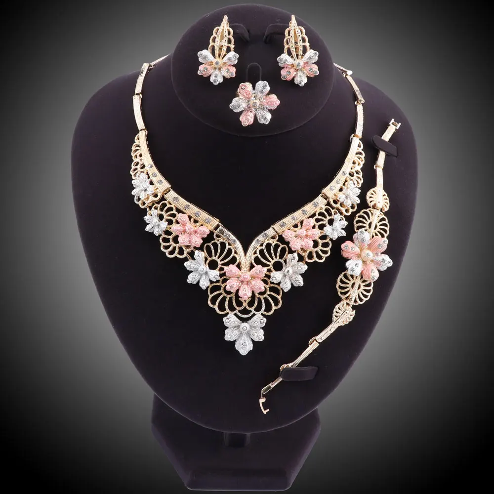 Топ продаж 2020 Новые цветочные Металлические Ювелирные наборы ожерелье + серьги + браслет + кольцо Хрустальный набор Модные женские индийские свадебные украшения