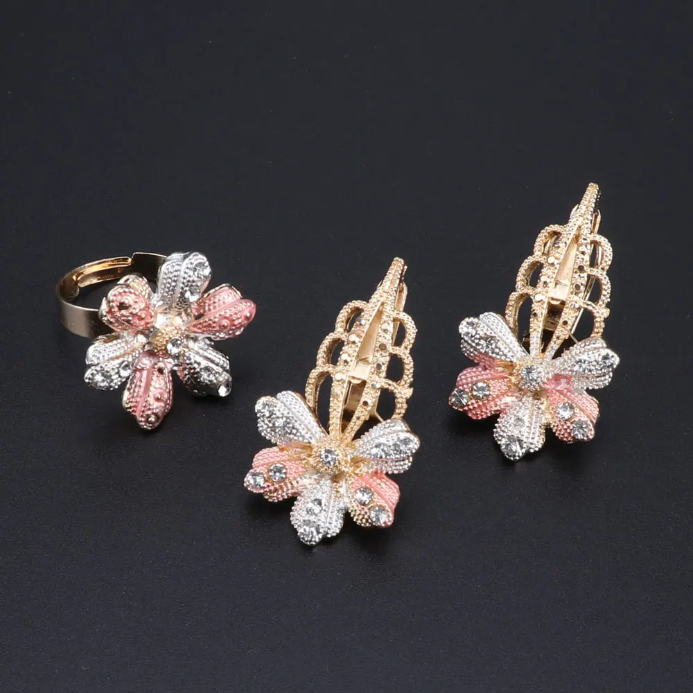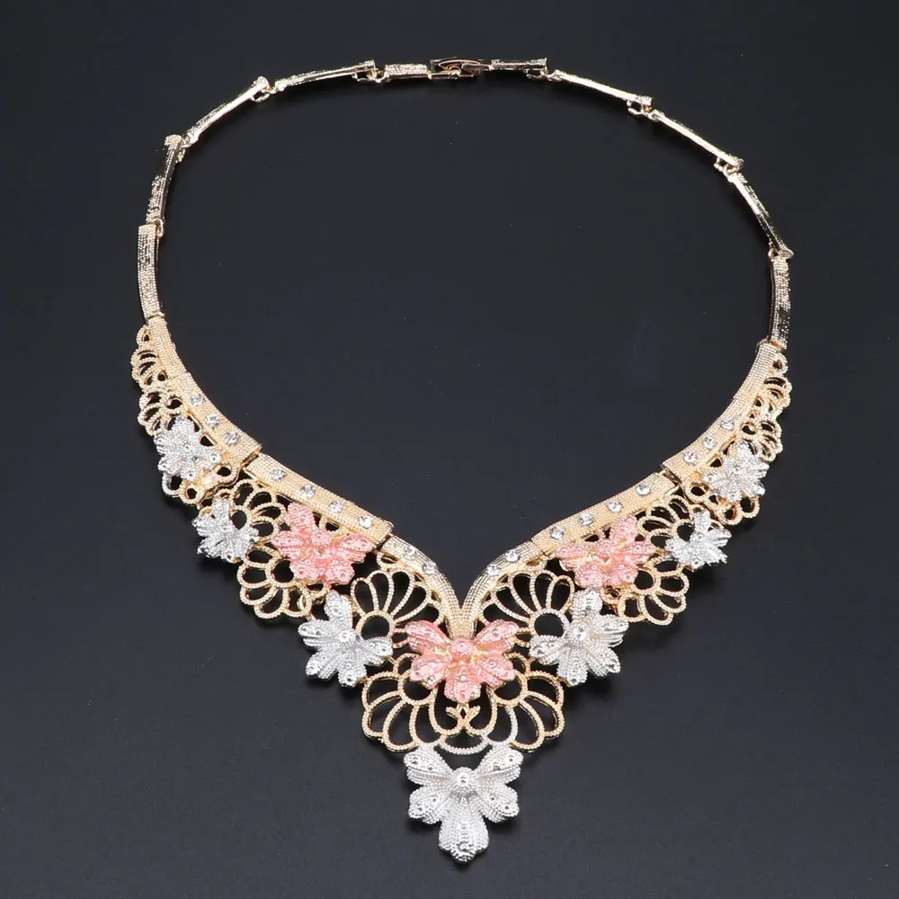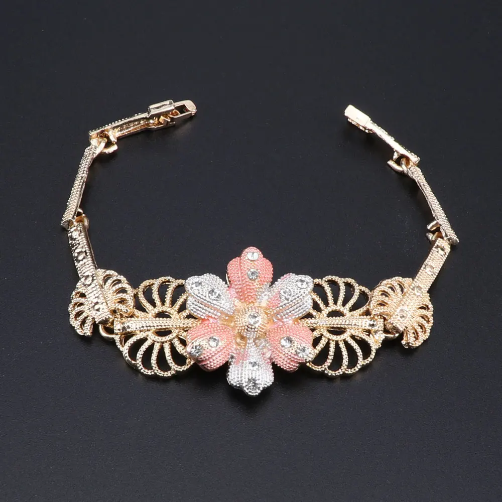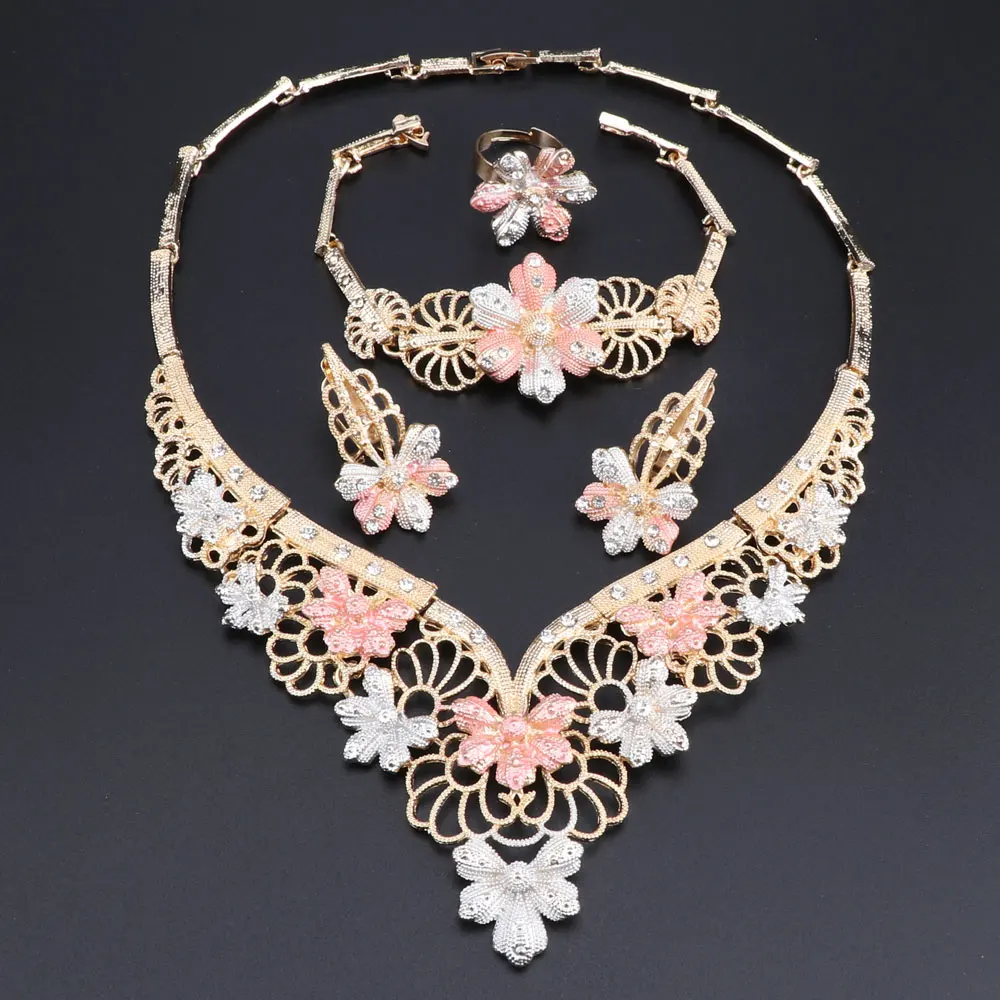 Топ продаж 2020 Новые цветочные Металлические Ювелирные наборы ожерелье + серьги + браслет + кольцо Хрустальный набор Модные женские индийские свадебные украшения