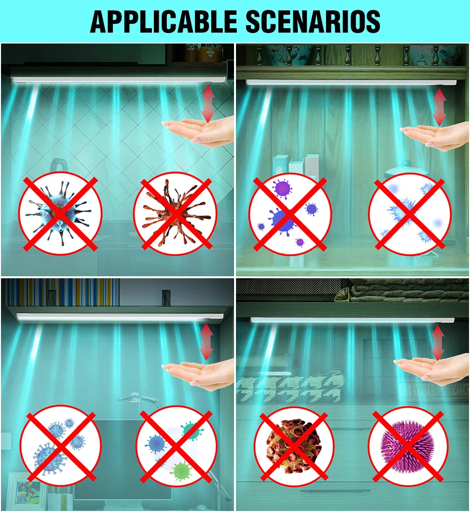 Если есть растения или аквариумы, которые не могут двигаться, накройте их непрозрачными газетами или тканью, тогда лучи UVC не проникают и не могут повредить их.После использования, потому что лампа убивала много бактерий в комнате, пожалуйста, откройте окна и двери, позвольте комнате проветривать 15 минут, а затем войти.Советы: Светильник автоматически включается и выключается ручным датчиком развертки.