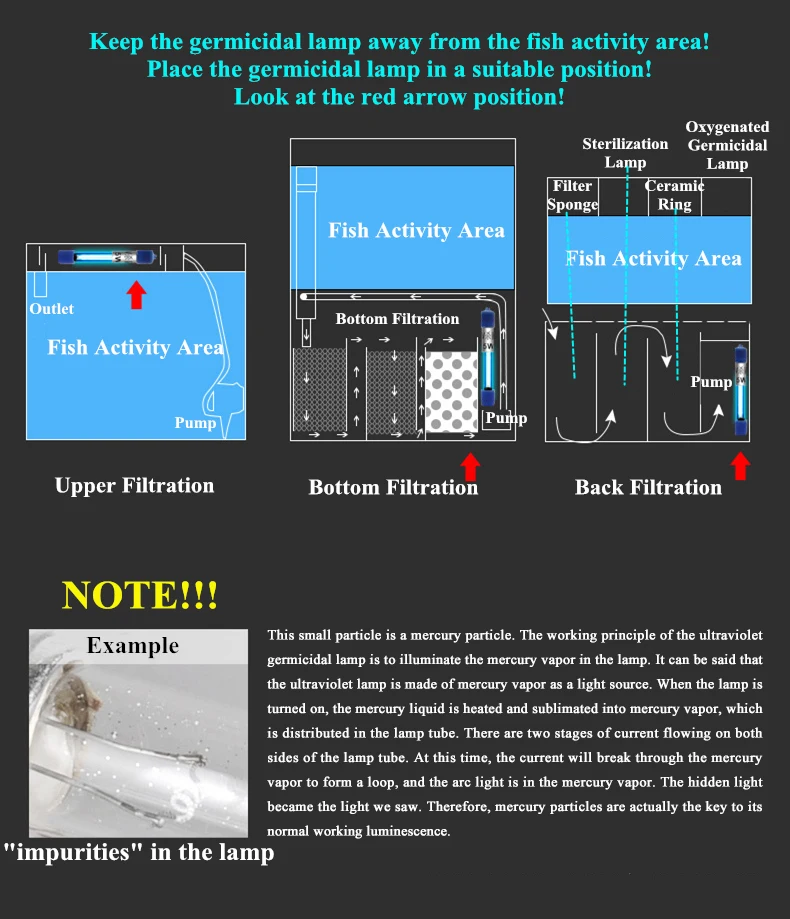3. Бактерицидная лампа может использоваться только в фильтрующем баке и не может использоваться непосредственно в аквариуме, в противном случае рыба будет ранена или скончалась из-за длительного ультрафиолетового излучения!