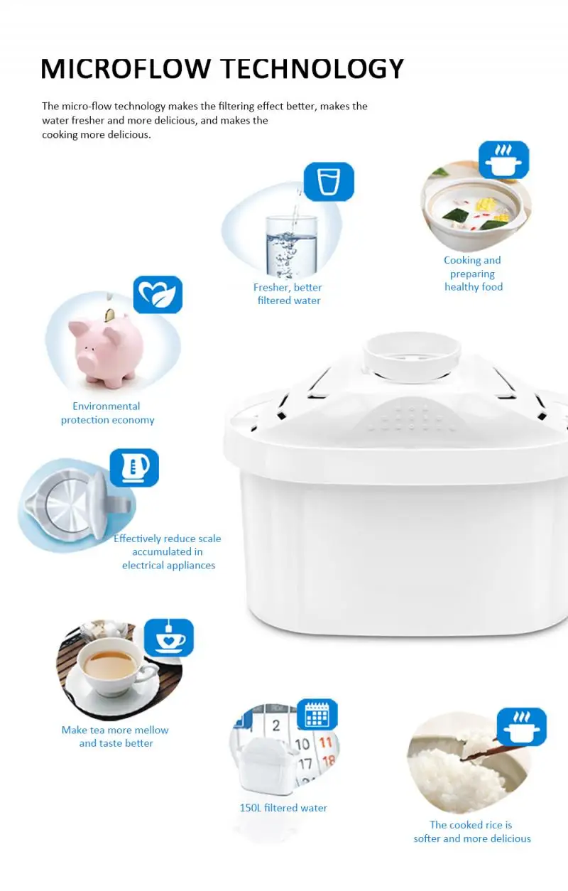 Технология micro-flow делает фильтрующий эффект лучше, делает воду более свежей и вкусной и делает приготовление пищи более вкусным.