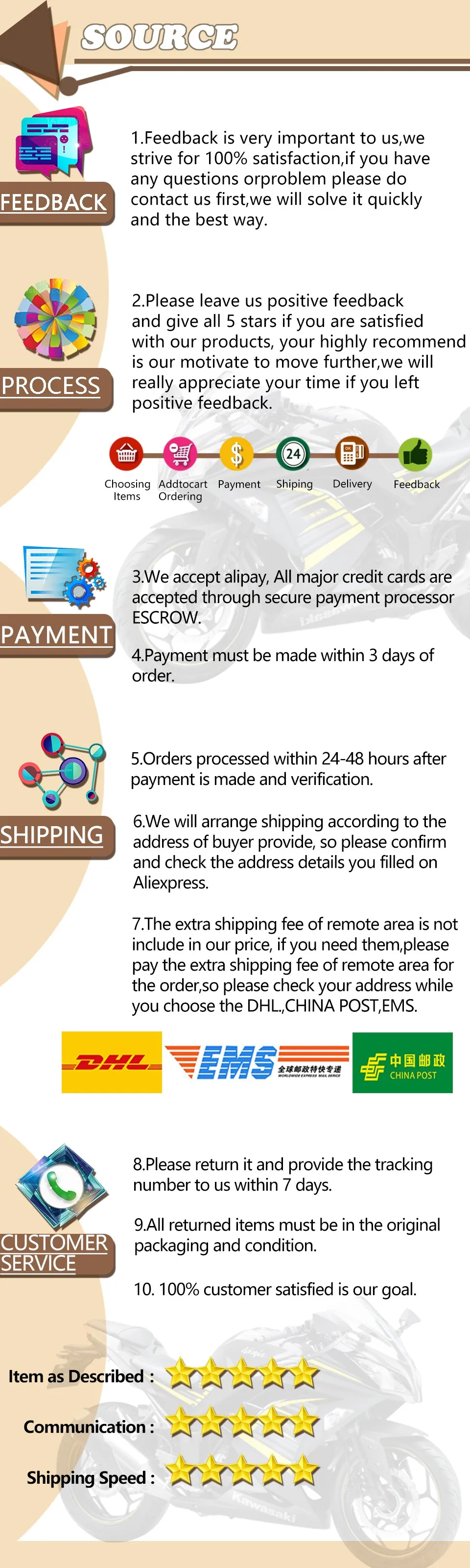 1. Пожалуйста, сравните наши продукты с вашим мотоциклом или предыдущими частями, у вас есть серьезные размеры, модель и другие аспекты перед покупкой.