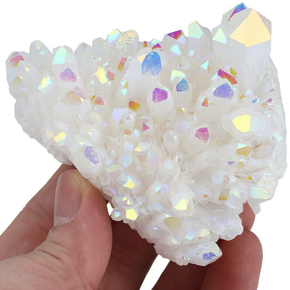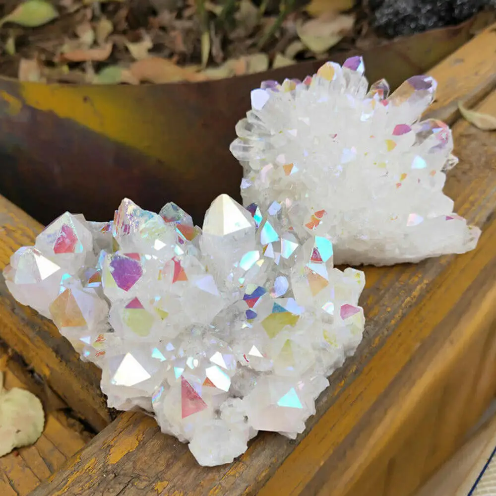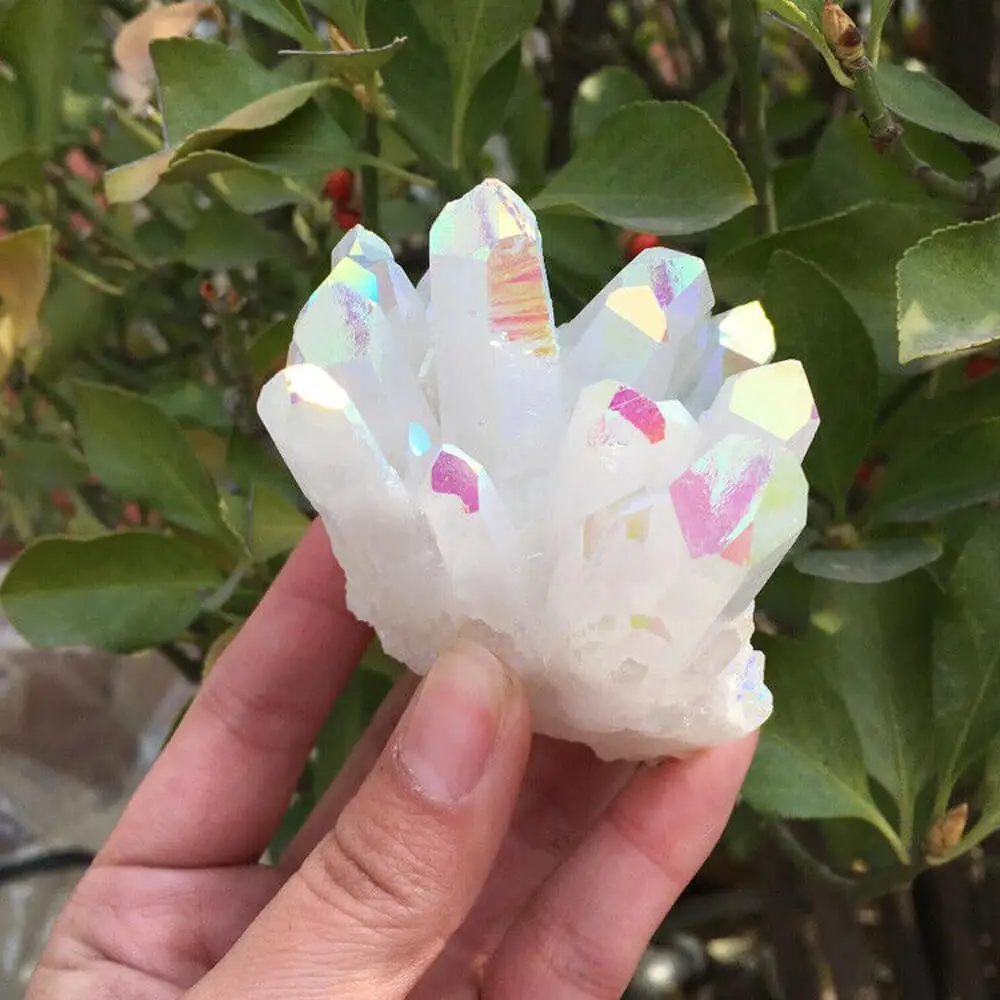 Природный кварцевый кластер был специально обработан в процессе, когда молекулярный слой титана плюс другие металлы был сплавлен на поверхность кварца. Это приводит к постоянному окрашиванию поверхности, создавая блестящий эффект.
