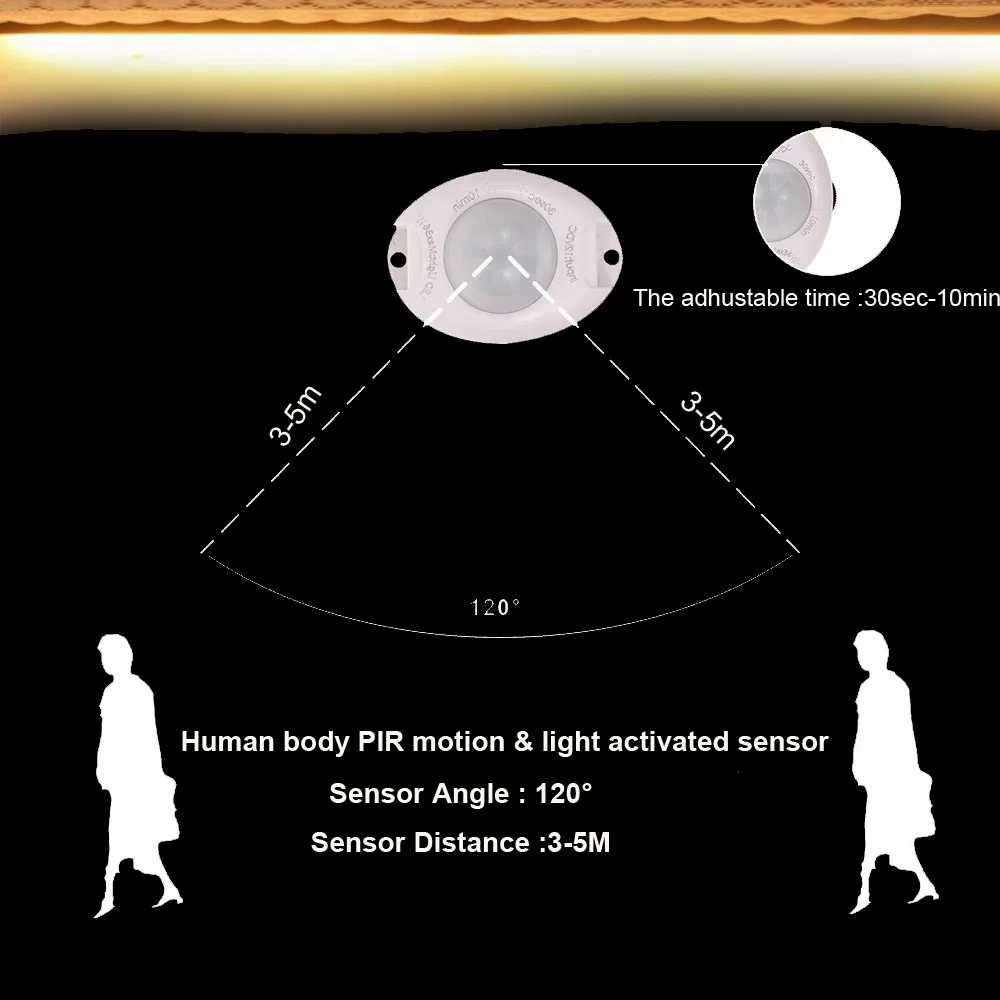 Длина: 1,2 метровЦветовая температура: 2700-3000KПотребление энергии: 3 ВтВыход: 12V/1A/0.5AВремя работы датчика: 30 сек-6 минПылезащитный и водонепроницаемый класс: IP65Эта Светодиодная лента и датчик PIR должны работать в темной зоне, например, ночью. Не яркая зона, пожалуйста, обратите внимание.(Односпальная кровать)Посылка включает в себя: