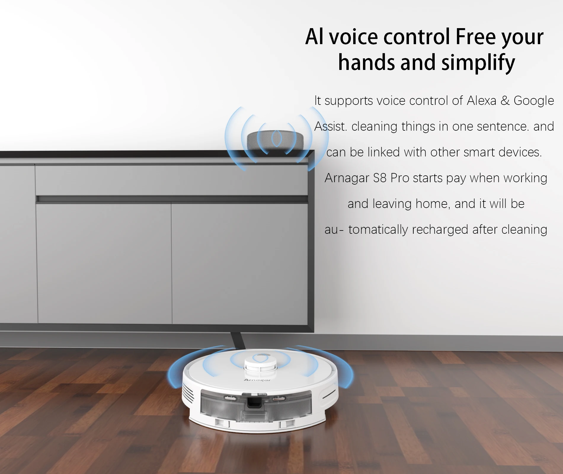 Поддержка голосового управления Alexa и Google Assist. Очистка вещей в одном предложении. И может быть связан с другими интеллектуальными устройствами. Arnagar S8 Pro начинает оплату при работе