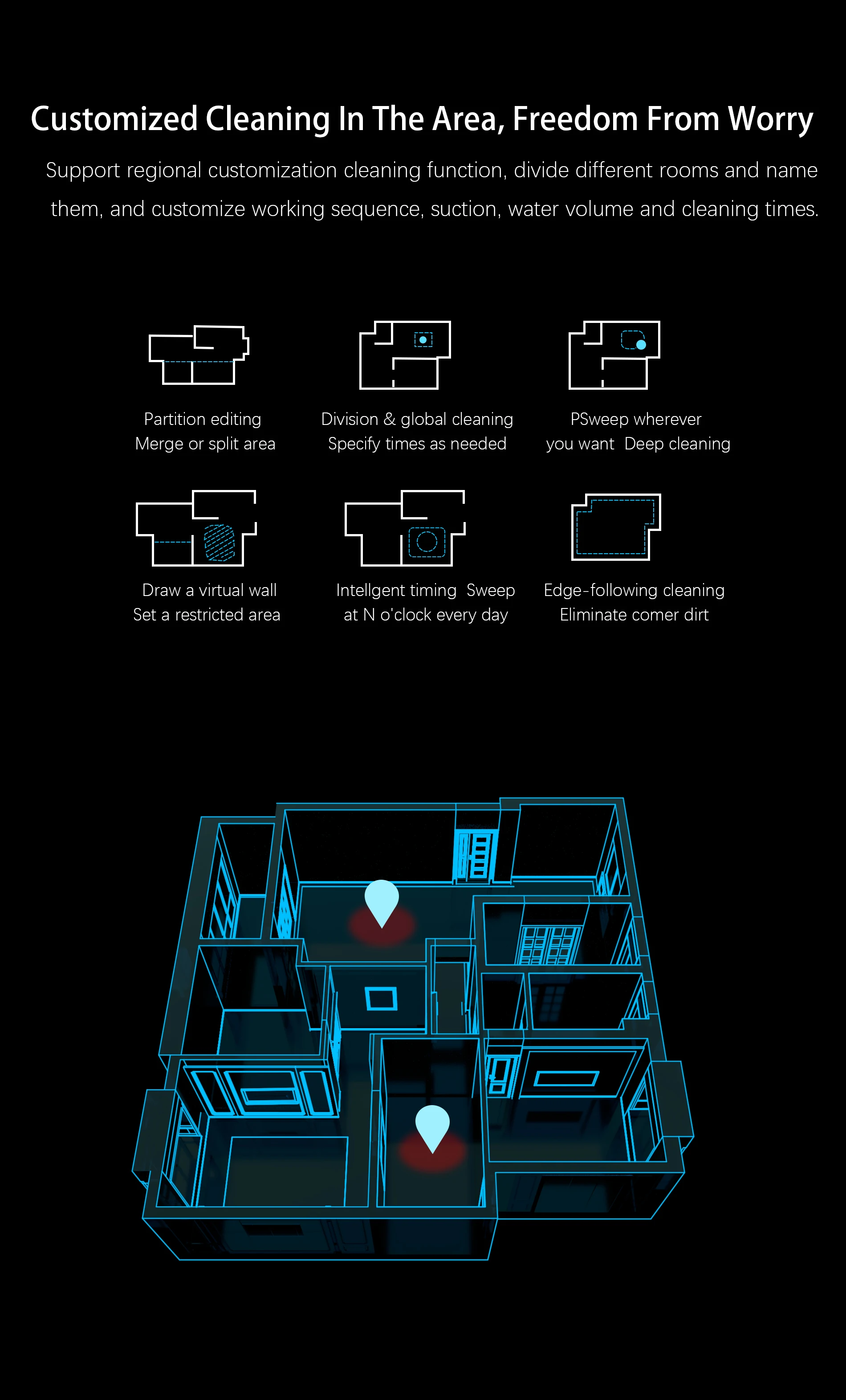 Поддержка функции уборки на заказ по регионам, разделение разных помещений и название, настройка рабочей последовательности, всасывания, объема воды и времени очистки