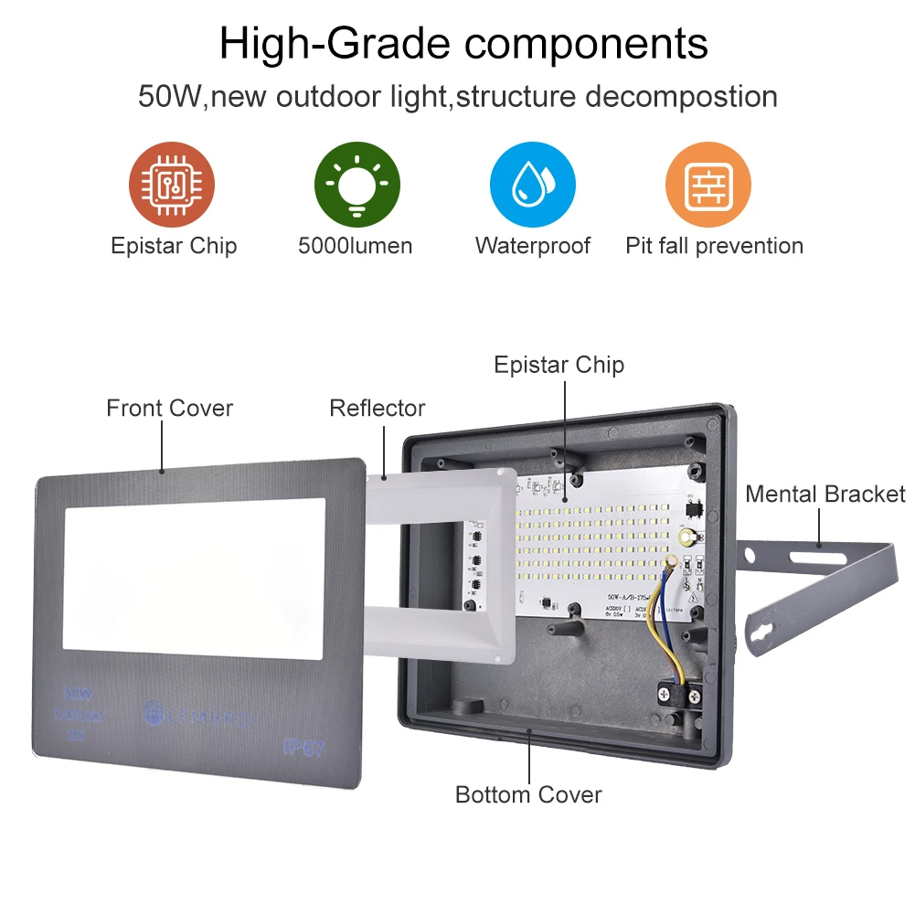 ▶Мощность: 50 Вт, 100 Вт, 150 Вт, 200 Вт, 300 Вт ▶Напряжение: 110 В 220 В ▶Цветовая температура: холодный белый 6000K ▶Люмен: 5000lm-30000lm ▶Материал: алюминий, закаленное стекло ▶Сверхлегкий и энергосберегающий светодиодный светильник с суперяркими бусинами, он может изготовить прозрачный белый светильник высокой яркости 100 лм на 1 Вт. С углом луча 120 °, он может идеально заменить традиционные галогенные лампы, помогая экономить более 80% затрат на электроэнергию, и больше не беспокойтесь о высокой стоимости электроэнергии. ▶[Стабильный и простой в монтаже] Этот прожектор оснащен расширенным и утолщенным регулируемым металлическим кронштейном, который является более стабильным и надежным; Вы можете легко установить его на потолок, стену, следуя несколько простых шагов проводки, регулируя различные углы заземления и других мест. ▶[Прочные материалы] Светодиодный прожектор изготовлен из литого под давлением алюминиевого корпуса и прочного закаленного стекла. Использование крупногабаритных печатных плат улучшает скорость рассеивания тепла и продлевает срок службы. ▶【 IP67 водонепроницаемый и широко используемый светодиодный прожектор имеет класс IP67, может хорошо работать под дождем, дождем и снегом. Подходит для внутреннего и наружного освещения, подходит для садов, квадратов, заводов, доков, стадионов и других мест, где требуется освещение.
