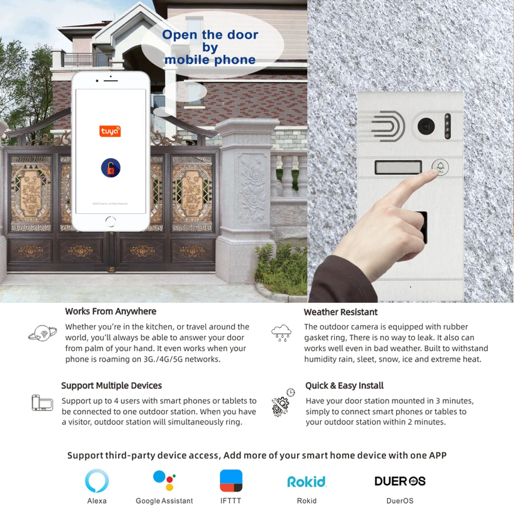 Модный внешний вид ♦ Камера 960P ♦ Поддержка отпечатков пальцев ♦ ИК-светодиоды для ночного видения ♦ Регулируемый громкость внутренней связи ♦ Двусторонний Интерком ♦ ИК-датчик, Автоматическое включение/выключение ИК-светодиодов ♦ Простая установка и установка DIY ♦ Антивандальная панель из алюминиевого сплава с защитой от коррозии ♦ IP65 защита от атмосферных воздействий |