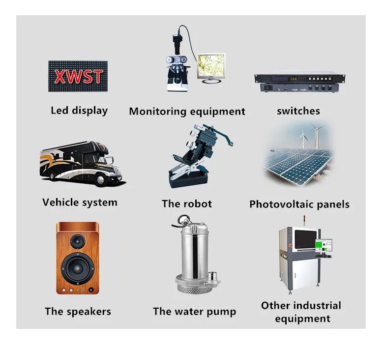 Область применения: различные модификации автомобильной системы, маршрутизатор, ADSL cat, переключатель, светодиодный светильник, цифровая фоторамка, электронный холодильник, портативный DVD, аудио, система безопасности, Портативные Инструменты, принтеры, сетевое оборудование, контрольное оборудование, все виды промышленного оборудования в соответствии с параметрами