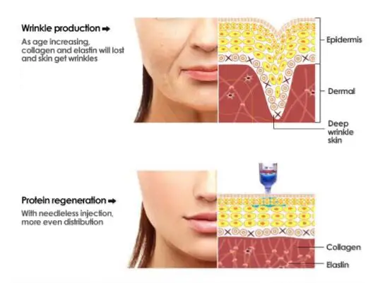 Водная мезотерапия заключается в впрыскивании гиалуроновой кислоты в кожу. Гиалуроновая кислота содержит влагу, в 200-300 раз более богатая, чем тело. Благодаря чему кожа становится гладкой, мягкой, яркой и увлажненной после инъекций. Для того, чтобы сохранить кожу увлажненной, дамы всегда выбирают различные продукты по уходу за кожей. На самом деле, продукты по уходу за кожей только увлажняют влагу на cutin. Так что при размазывании эти продукты не могут глубоко обеспечить влагу для кожи. Как мы знаем, акне, морщинки и неэластичность появятся, если кожа не будет влагой. Водная мезотерапия решает все проблемы из-за отсутствия влаги, таких как шеллоидная кожа, цветовое пятно, морщинки... И он обеспечит влагу для дермы. Поэтому водная мезотерапия хорошо работает на отбеливании, увлажнении и обновлении неэластичности