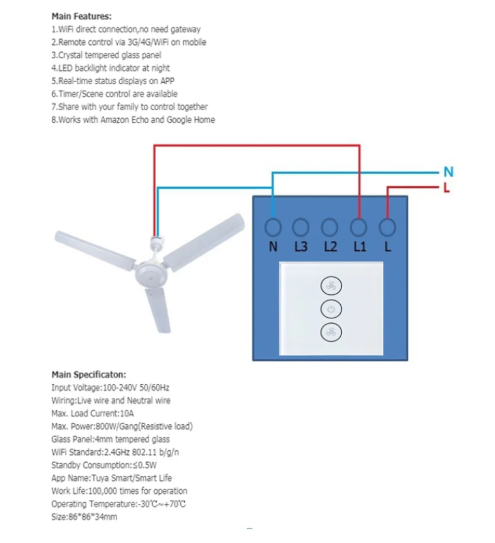Основные параметры переключателя вентилятора: Бренд: MEKISS Применимые продукты: различные регулируемые вентиляторы Размер изделия: 86*86*34 мм Рабочее напряжение: 100-240 В переменного тока, 50/60 Гц Стандарт WIFI: 2,4 ГГц 802,11 b / g / n Мощность нагрузки: ≤ 400 Вт Потребляемая мощность в режиме ожидания: ≤ 0,5 Вт Срок службы:> = 100000 раз Материал корпуса: АБС огнестойкий материал Стеклянная панель: 4 мм полностью закаленное стекло Рабочая температура: 0 ℃ ~ 80 ℃ Относительная влажность: 10% ~ 93% Метод управления: сенсорный, мобильный телефон, совместим с сторонними продуктами голосового управления Способ подключения: нейтральный + живой Приложение: Smart Life, tuya Основные характеристики и пункты продажи: 1. Он может быть непосредственно подключен к WiFi без шлюза; 2. Дистанционное управление через 3G / 4G на мобильный телефон в любое время, в любом месте, просто включите GPRS сигнал; 3. Хрустальная панель из закаленного стекла, толщина стеклянной панели 4 мм, которая более кристально чистая и более текстурированная, чем обычная панель переключателя; 4. Светодиодный подсказки подсветки для легкой идентификации и работы в ночное время; 5. Операция может быть двунаправленная отзывы, то есть состояние устройства ВКЛ, ВЫКЛ, стоп и т. Д. Будет отображаться в режиме реального времени на стороне приложения; 6. Несколько групп таймингов могут быть установлены в соответствии с предпочтениями клиента, а также контролем сцены; 7, поддержка приложения smart life, на стороне приложения, вы можете поделиться общим контролем использования с семьей; 8. Домашнее использование поддерживает Tmall Genie, зарубежное использование может работать с Amazon ECHO series (Alexa APP), Google Home (Google Assistant), Google nest.
