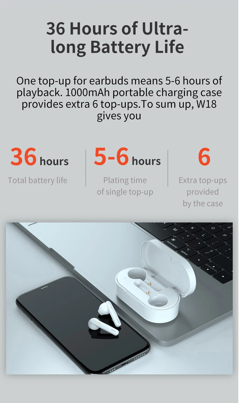 Один Топ со шнуровкой для наушники означает 5-6 часов в режиме Playback.1000mah портативный зарядный чехол обеспечивает дополнительную 6 top-ups.to одним словом, W18 в течение нескольких дней. Общий срок службы батареи: 36 часов Время покрытия одного верха: 5-6 часов Дополнительный верх, предоставляемый чехол: 6