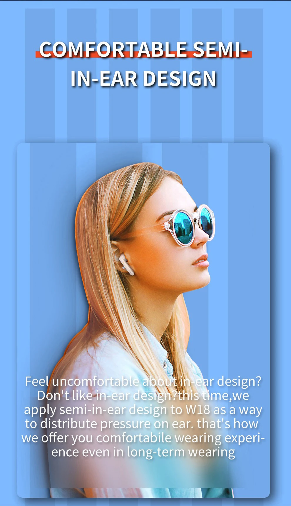 Современный чипсет оснащен DSP, чтобы блокировать окружающий звук. Tw o mics еще раз отменить заземляющий шум. Теперь вы можете наслаждаться кристально чистым разговором. Чувствую себя некомфортно в ушах? Не нравится дизайн в ухе? На этот раз мы применяем дизайн полув ухе. W18 как способ распределения давления на ухо. Вот как мы предлагаем you.com удобный опыт ношения даже в длительном ношении.