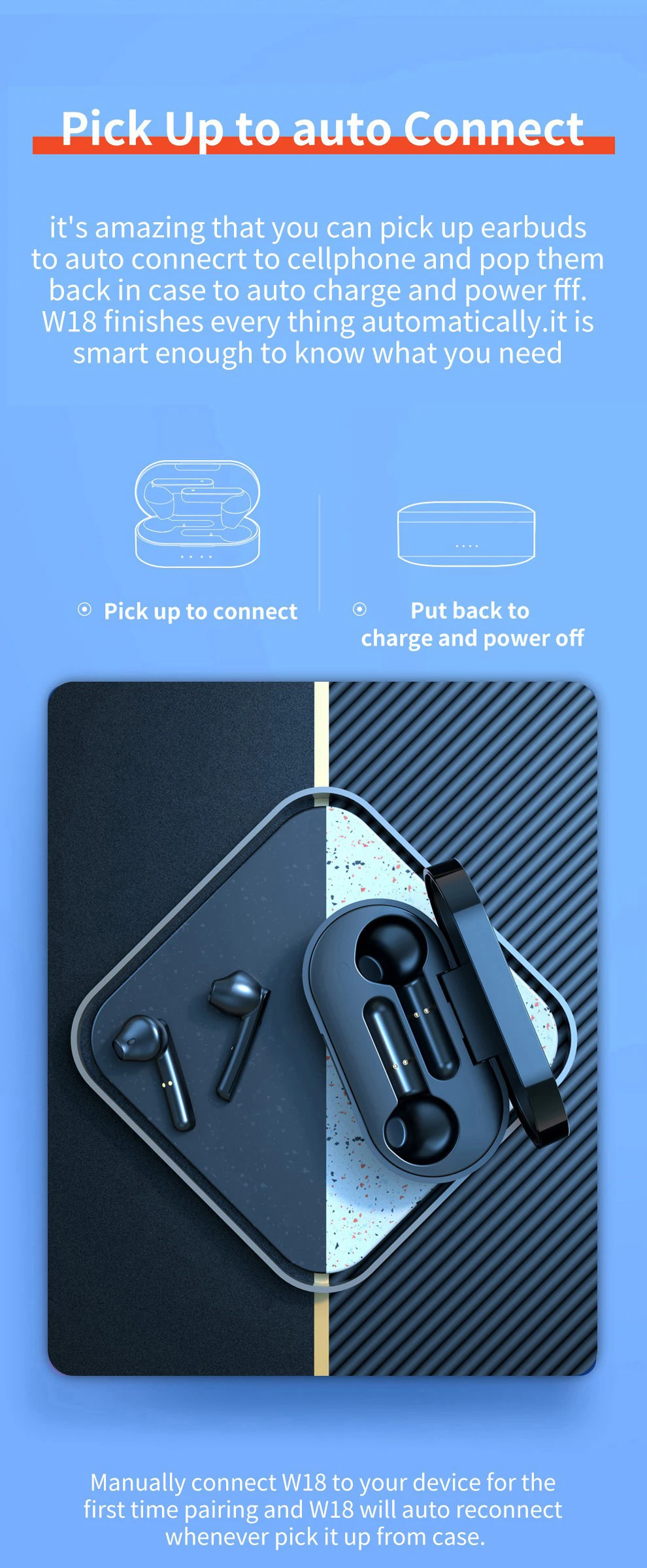 Удивительно, что вы можете взять наушники для автоматического подключения к мобильному телефону и вставить их обратно в чехол, чтобы автоматически зарядить и выключить питание. W18 автоматически завершает каждую вещь. Он достаточно умный, чтобы знать, что вам нужно. Подобрать для подключения Положите обратно, чтобы зарядить и выключить питание Вручную Подключите W18 к вашему устройству для Первый раз сопряжение и W18 будет автоматически повторно подключаться Каждый раз, когда вы берете его из чехол.
