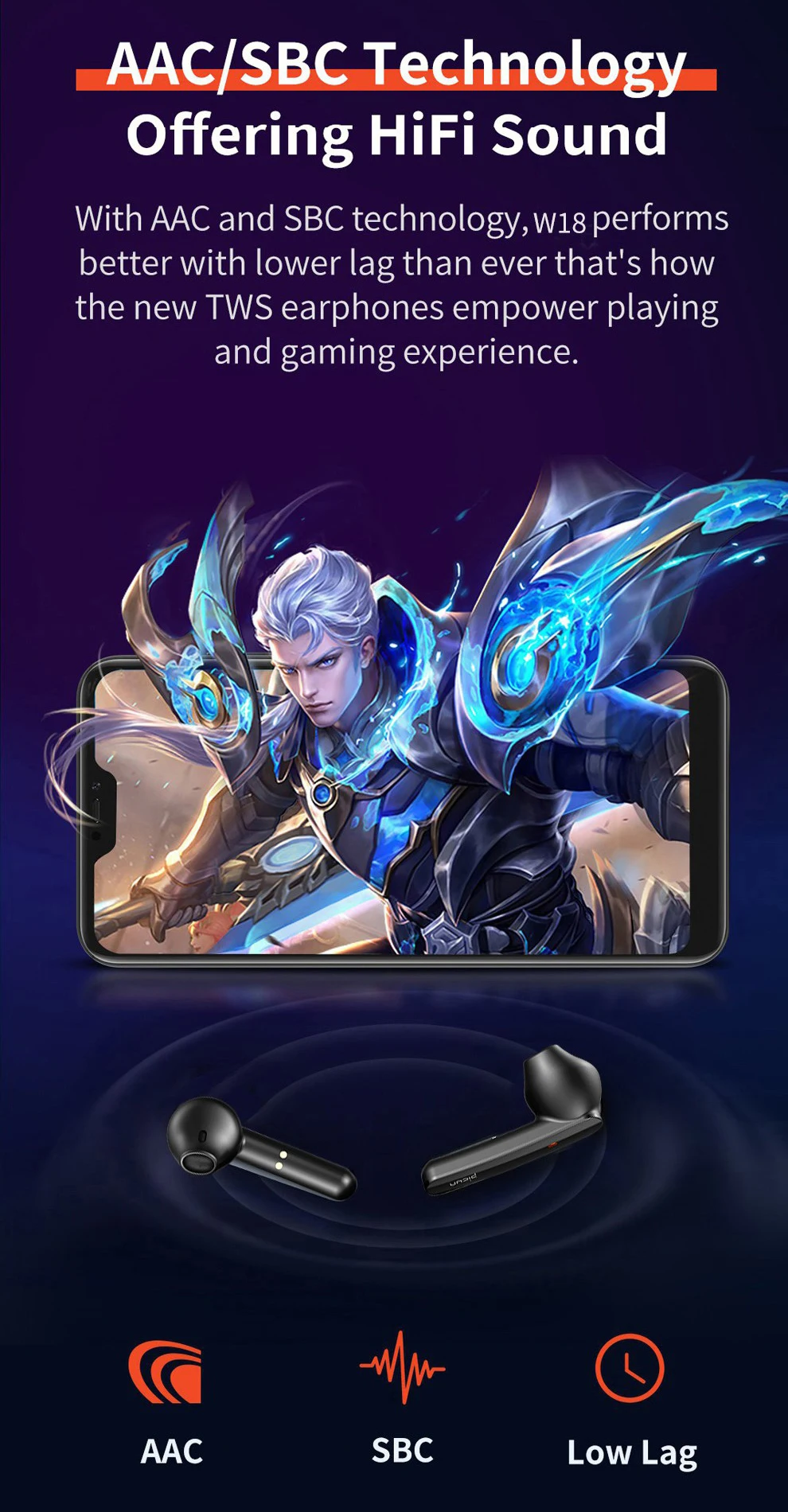 Доступны как стерео, так и моно режимы. Выберите режим стерео и режим моно, чтобы удовлетворить ваши практические circum-stance.one W18 дает вам различные возможности с двумя режимами. Технология AAC/SBS предлагает HIFI Звук. С технологией AAC и SBCtechnology.W18 работает лучше с более низким лагом, чем когда-либо, так что новые наушники TWS расширяют возможности воспроизведения и игр.