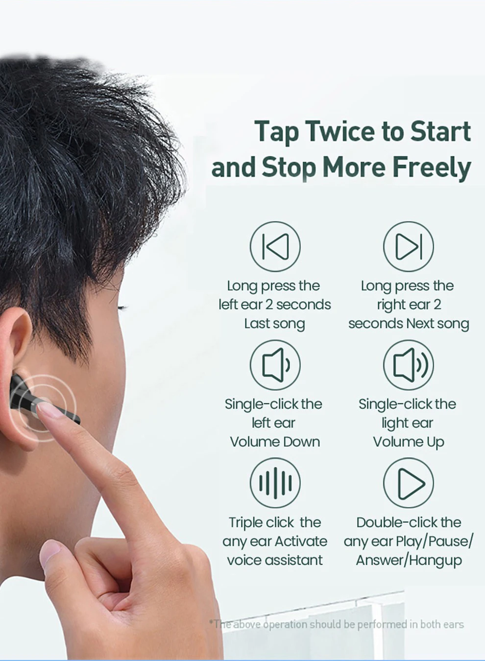 Уменьшая давление на уши, встроенный датчик освобождает вас от давления при прикосновении к стержню. Нажмите дважды, чтобы начать и остановить более свободно Последняя песня: нажмите на левое ухо 2 секунды Следующая песня: Нажмите и удерживайте правое ухо 2 секунды Уменьшение громкости: Одно нажатие на левое ухо Увеличение громкости: одним нажатием на светильник Активация голосового ассистента: Тройное нажатие на любое ухо воспроизведение/пауза/ответ/hangup: двойное нажатие на любое ухо