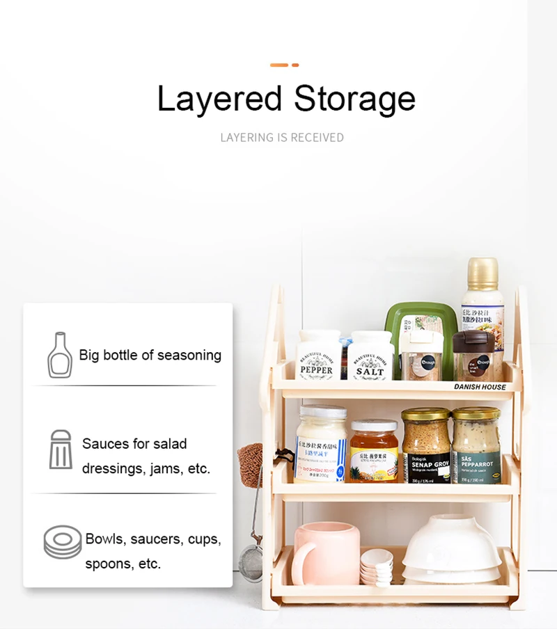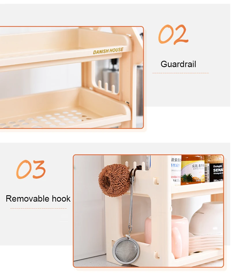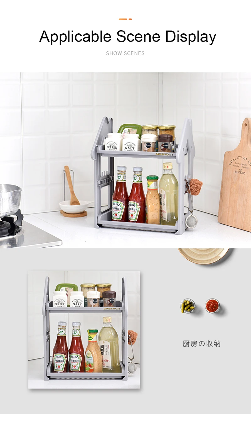 Это многофункциональная двухслойная полка, в основном используется для размещения предметов на кухне, гостиной, ванной и спальне. Эта стойка отстегивается в целом и изготовлена из пищевого полипропилена. Это безопасно и Нетоксично, и может быть в контакте с едой. Он не выцветает, не деформируется и не подвержен коррозии!