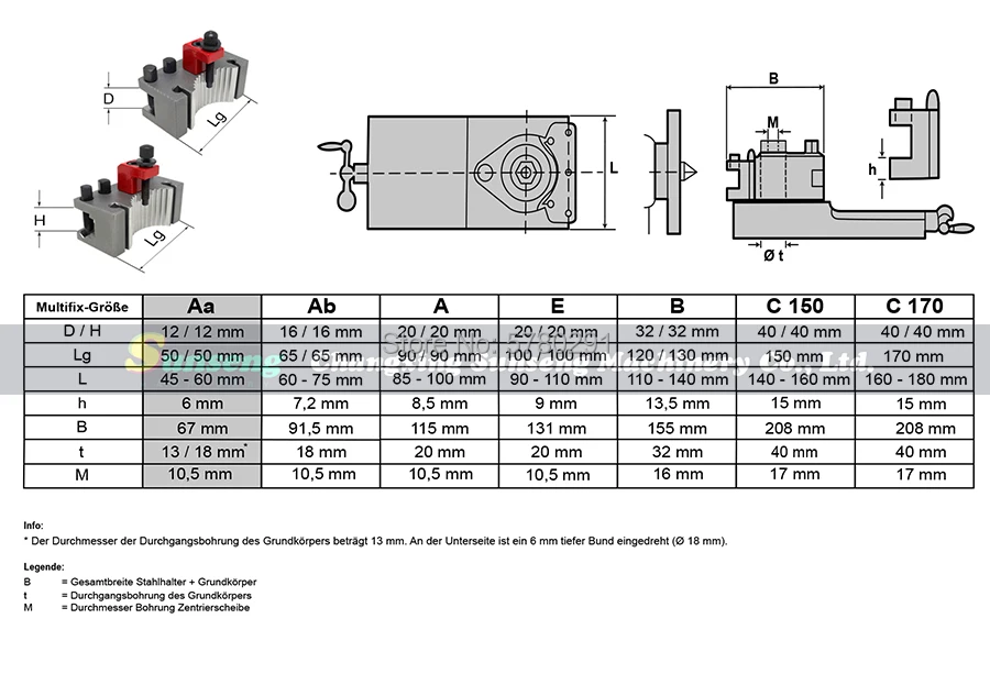 Technical specifications Repeatability [mm]: 0.01 Recommended top slide width [mm]: 45 - 60 Adjustable turning tool height [mm]: 4 - 12 Turning diameter [mm]: 120 - 300 Degree of hardness of base body [HRC]: 50 Degree of hardness steel holder [HRC]: 40 Tool material base: C45E steel Tool material steel holder: C45E steel Surface: sanded scope of delivery 1 x basic body 3 x steel holder AaD 1250 1 x steel holder AaH 1250 1 x wrench 1 x square key