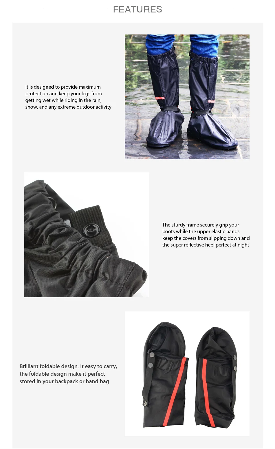 • Очень удобные Чехлы для ботинок. Прочная оправа надежно удерживает ваши сапоги, а верхние эластичные ленты не скользят вниз, а супер отражающий каблук идеально подходит ночью.