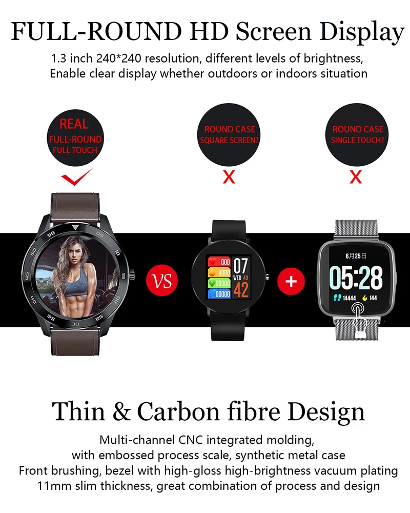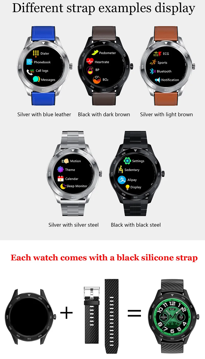Хотя браслет может контролировать частоту сердечных сокращений, он не может быть использован для каких-либо медицинских целей, просто чтобы помочь людям вести более здоровый образ жизни. Все результаты измерений приведены только для справки. Они основаны на разумных алгоритмах и датчиках, поэтому, пожалуйста, не сравнивайте их с медицинскими устройствами, мы ценим ваше понимание. Основная функция: * Спортивные функции: ходьба, бег, Велоспорт, альпинизм, плавание * Функция здоровья: мониторинг сердечного ритма, мониторинг артериального давления и кислорода, измерение электрокардиограммы, мониторинг сна, удаленный автотаймер * Функция дистанционного управления: напоминание о звонках/сообщениях, напоминание о социальных сообщениях (Whatsapp, WeChat, QQ, Facebook, Twitter и т. д.), дистанционное управление музыкой, прогноз погоды, поиск мобильный телефон/полоса, будильник, напоминание о малоподвижности. * Функция настройки часов: Поднимите запястье для пробуждения экрана, Отрегулируйте яркость и измените циферблат Параметры часов: * Материал ремешка: поликарбонат * Тип сенсора: одно касание * 1,3 дюймов цветной экран * Разрешение экрана 240*240 * Встроенный аккумулятор 300 мАч, время работы в режиме ожидания 7 дней * Система IOS находится в Apple store, а телефон на Android можно найти и загрузить через JYouPro в App Store.) Android 4,4 и выше, IOS 8,0 и выше * IP67 водонепроницаемый * Фиксированные языки: английский (по умолчанию), немецкий, испанский, итальянский, французский, португальский (Португалия), русский, турецкий * Языки приложения: русский, немецкий, итальянский, японский, французский, китайский, английский, португальский, испанский Аксессуары для посылка Коробка продукта * 1, руководство по эксплуатации * 1, умные часы * 1, зарядное устройство * 1 Примечание: Не помещайте часы в горячую воду. После получения часов, пожалуйста, сначала зарядите его. Из-за длительной логистики батарея часов низкая. Перед использованием, пожалуйста, отсканируйте qr-код в руководстве, чтобы загрузить приложение, а затем подключите его к приложению.