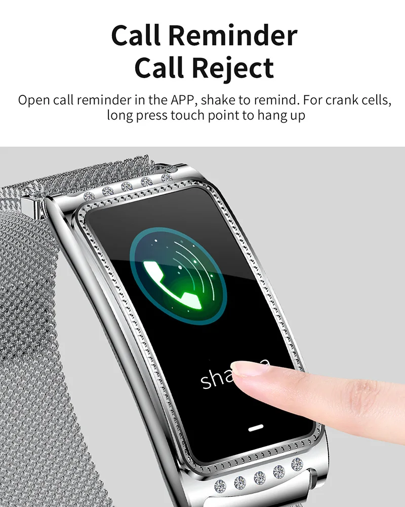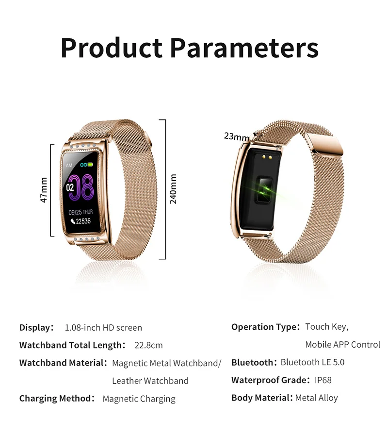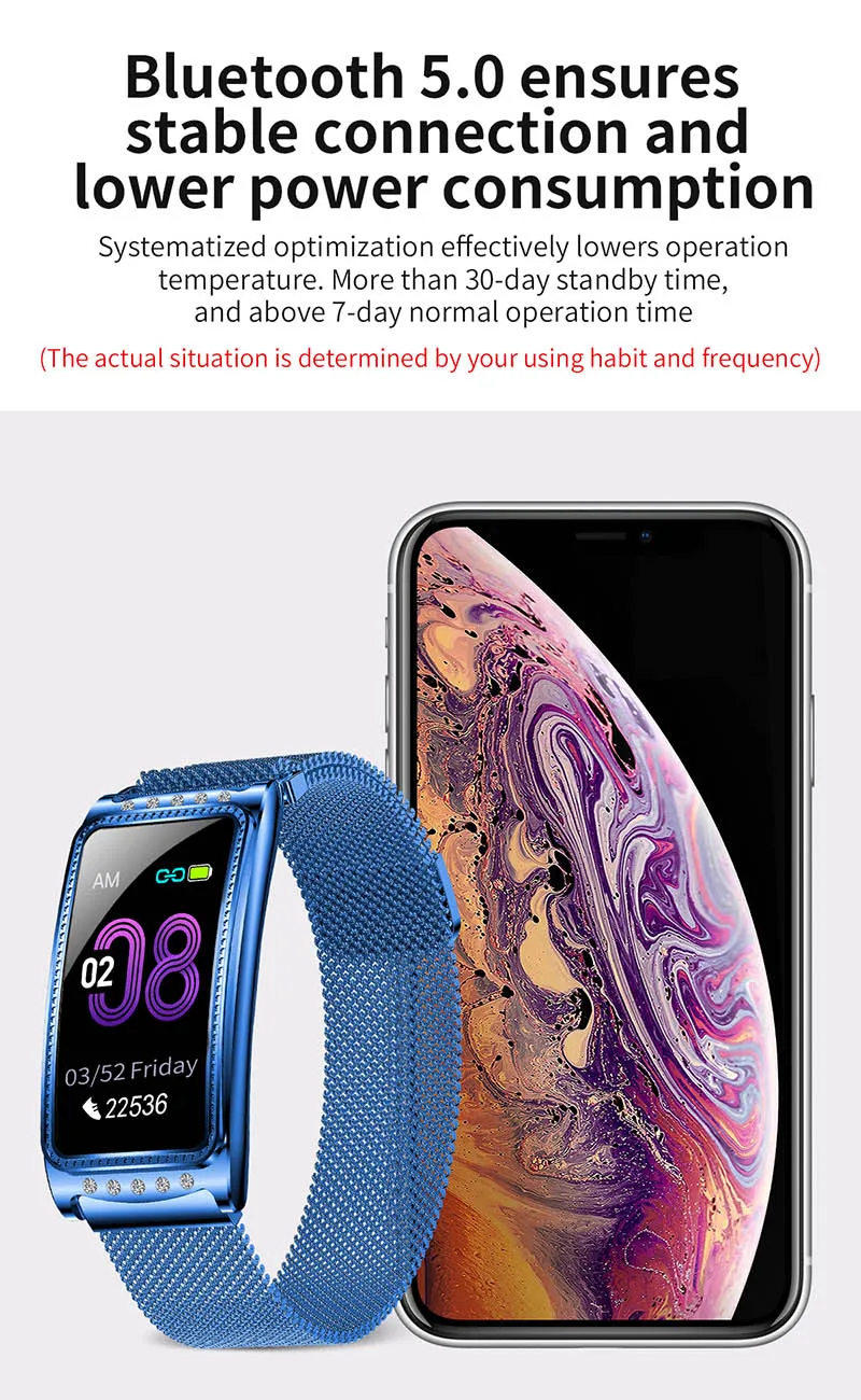 Хотя браслет может контролировать частоту сердечных сокращений, он не может быть использован для каких-либо медицинских целей, просто чтобы помочь людям вести более здоровый образ жизни. Все результаты измерений приведены только для справки. Они основаны на разумных алгоритмах и датчиках, поэтому, пожалуйста, не сравнивайте их с медицинскими устройствами, мы ценим ваше понимание. Основная функция: * Спортивные функции: ходьба, бег, Велоспорт, альпинизм, плавание * Функция здоровья: мониторинг сердечного ритма, мониторинг артериального давления и кислорода, измерение электрокардиограммы, мониторинг сна, удаленный автотаймер * Функция дистанционного управления: напоминание о звонках/сообщениях, напоминание о социальных сообщениях (Whatsapp, WeChat, QQ, Facebook, Twitter и т. д.), дистанционное управление музыкой, прогноз погоды, поиск мобильный телефон/полоса, будильник, напоминание о сидячем положении * Функция настройки часов: Поднимите запястье для пробуждения экрана, Отрегулируйте яркость и измените циферблат Параметры часов: * Материал ремешка: магнитный металл * Тип сенсора: одно касание * 1,08 дюймовый цветной экран * Разрешение экрана 240*240 * Встроенный аккумулятор 105 мАч, 7 дней в режиме ожидания * Система IOS находится в Apple store, а телефон на Android можно найти и загрузить через JYouPro в App Store. * IP67 водонепроницаемый * Фиксированные языки: китайский, английский, корейский, японский, немецкий, испанский, французский, итальянский, португальский, арабский, русский, голландский, хинди, польский * Языки приложения: китайский, русский, турецкий, немецкий, итальянский, японский, французский, польский, традиционный, английский, голландский, португальский, испанский, арабский, корейский Аксессуары для посылка Коробка продукта * 1, руководство * 1, умные часы * 1, зарядное устройство * 1 Примечание: Не помещайте часы в горячую воду. После получения часов, пожалуйста, сначала зарядите его. Из-за длительной логистики батарея часов низкая. Перед использованием, пожалуйста, отсканируйте qr-код в руководстве, чтобы загрузить приложение, а затем подключите его к приложению.