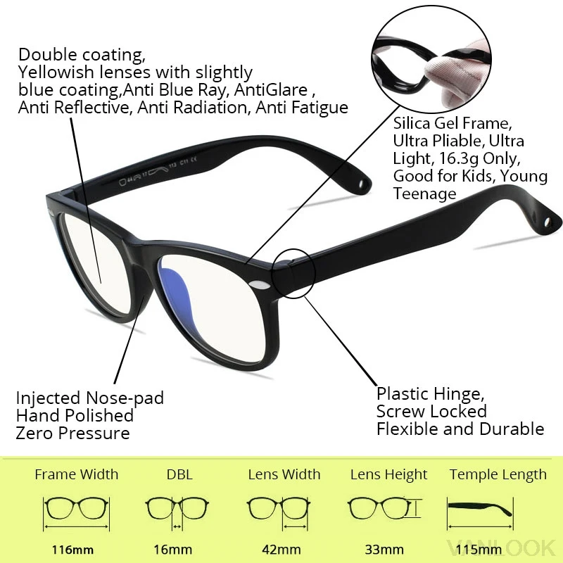 1. Модные детские очки 2. Фирменный дизайн 3. Высококачественная рамка из силикагеля, Ультра гибкая, ультра легкая, здоровая для кожи 4. Заводская цена 5. Прозрачные очки для компьютера, игр, экрана телефона 6. Унисекс, оправа для мальчиков или девочек, подходит для детей 7. Анти-излучение, анти-синий луч, антибликовые