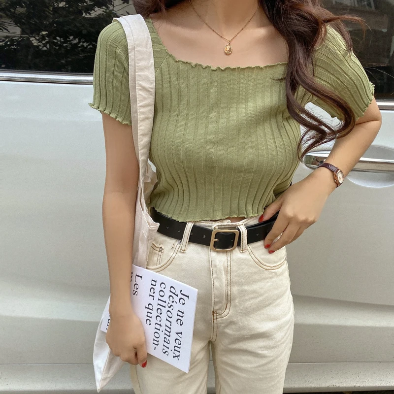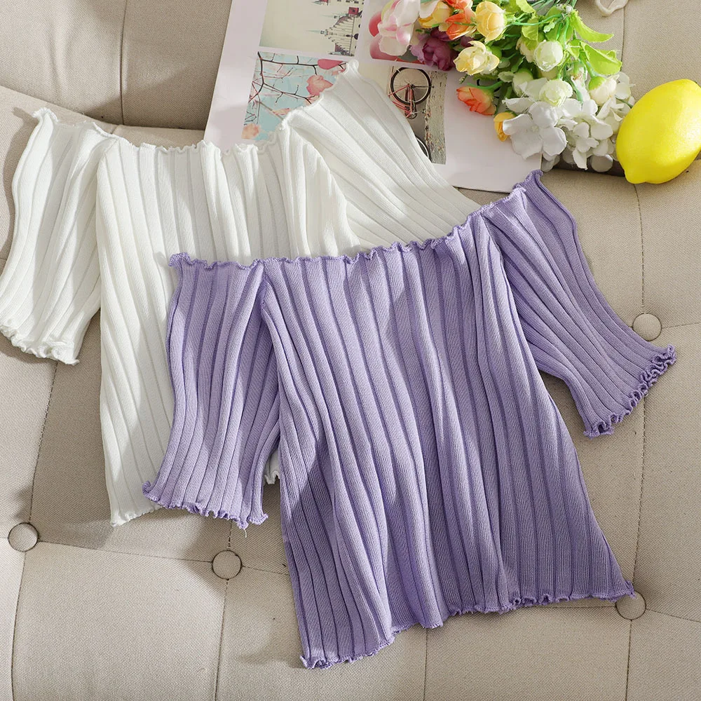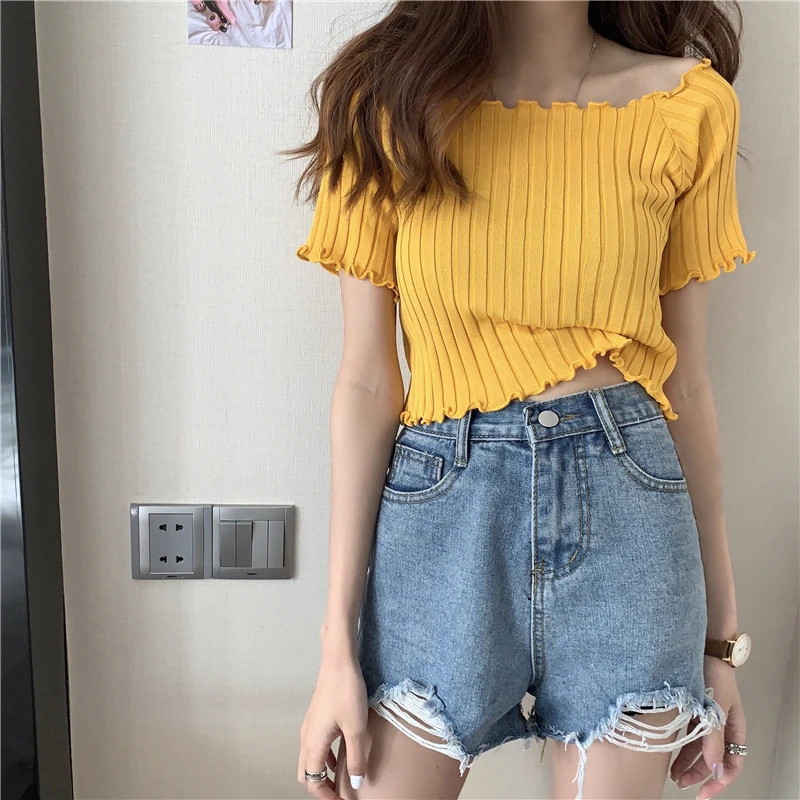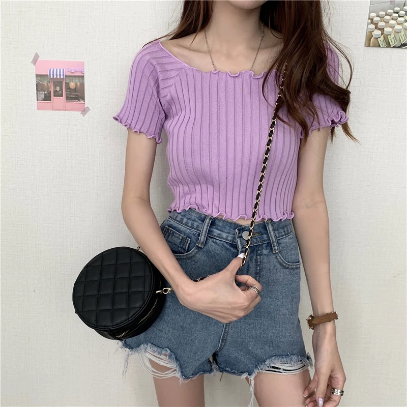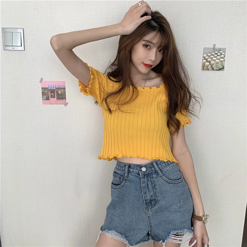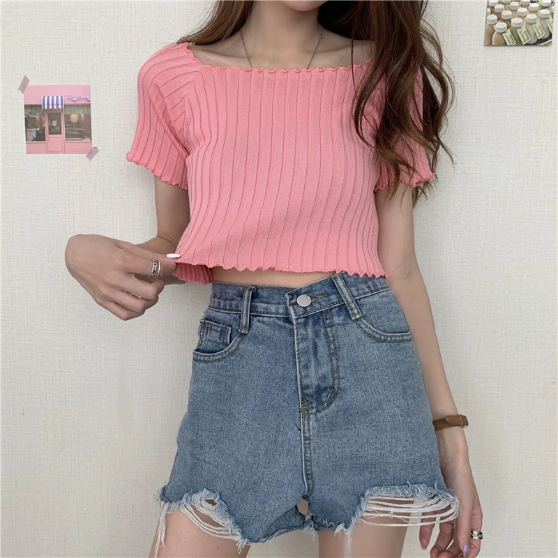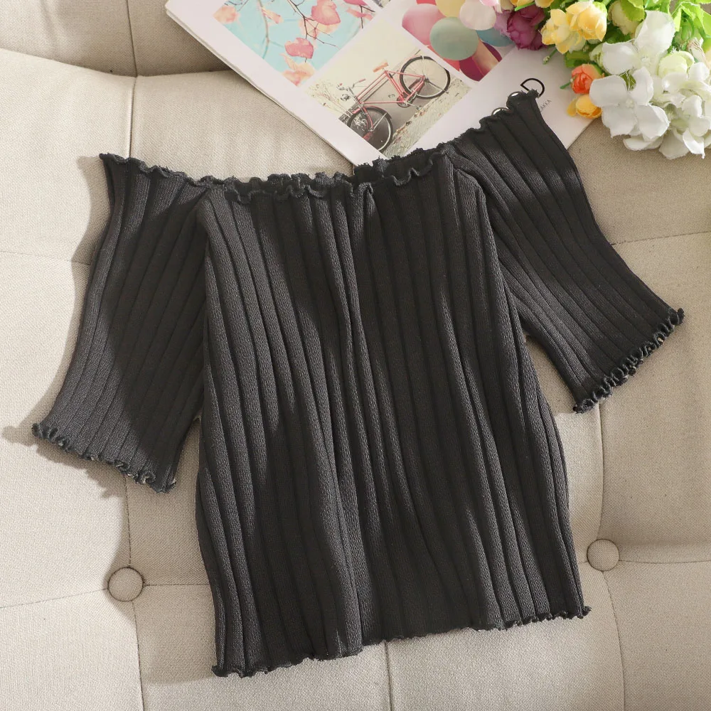 Женский трикотажный топ с открытыми плечами Pearl Diary, короткий рукав, ребристый кроп-топ с отделкой по краям, сексуальный тонкий повседневный укороченный топ