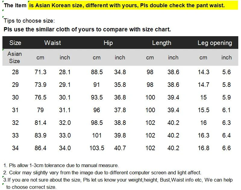 Данный товарАзиатский корейский размер, отличается от вашего, пожалуйста, дважды проверьте обхват талии брюк.