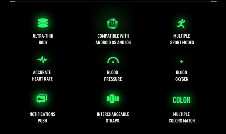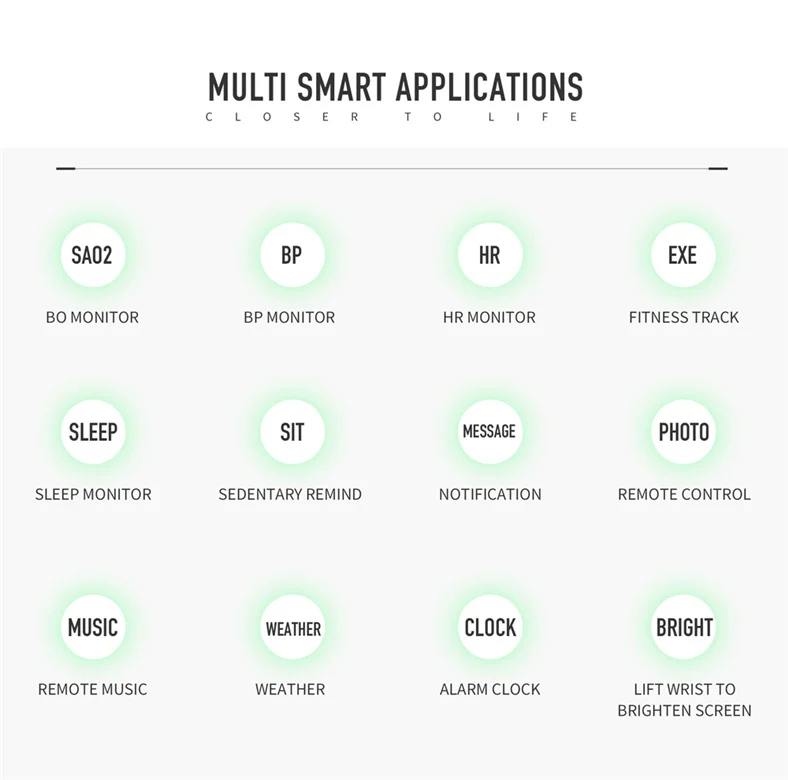 Хотя браслет может контролировать частоту сердечных сокращений, он не может быть использован для каких-либо медицинских целей, просто чтобы помочь людям вести более здоровый образ жизни. Все результаты измерений приведены только для справки. Они основаны на разумных алгоритмах и датчиках, поэтому, пожалуйста, не сравнивайте их с медицинскими устройствами, мы ценим ваше понимание. Основная функция: * Спортивные функции: ходьба, бег, Велоспорт, плавание, альпинизм, баскетбол, бадминтон, настольный теннис, футбол * Функция здоровья: мониторинг сердечного ритма, мониторинг артериального давления и кислорода, измерение электрокардиограммы, мониторинг сна, удаленный автотаймер * Функция дистанционного управления: напоминание о звонках/сообщениях, напоминание о социальных сообщениях (Whatsapp, WeChat, QQ, Facebook, Twitter и т. д.), дистанционное управление музыкой, прогноз погоды, поиск мобильный телефон/полоса, будильник, напоминание о сидячем положении * Функция настройки часов: Поднимите запястье для пробуждения экрана, Отрегулируйте яркость и измените циферблат Параметры часов: * Материал ремешка: силикон, стальной ремешок * Тип сенсора: одно касание * 1,3 дюймов цветной экран * Встроенный аккумулятор 140 мАч, время работы в режиме ожидания 7 дней * Система IOS находится в Apple store, а телефон на Android можно найти и загрузить через JYouPro в App Store.) Android 4,4 и выше, IOS 8,0 и выше * IP67 водонепроницаемый * Фиксированные Языки: немецкий, русский, французский, японский, испанский, итальянский, английский, португальский, арабский, тайский, китайский * Языки приложения: русский, турецкий, иврит, немецкий, итальянский, японский, французский, польский, тайский, упрощенный китайский, традиционный китайский, английский, португальский, испанский, арабский Аксессуары для посылка Коробка продукта * 1, руководство по эксплуатации * 1, умные часы * 1, зарядное устройство * 1 Примечание: Не помещайте часы в горячую воду. После получения часов, пожалуйста, сначала зарядите его. Из-за длительной логистики батарея часов низкая. Перед использованием, пожалуйста, отсканируйте qr-код в руководстве, чтобы загрузить приложение, а затем подключите его к приложению.