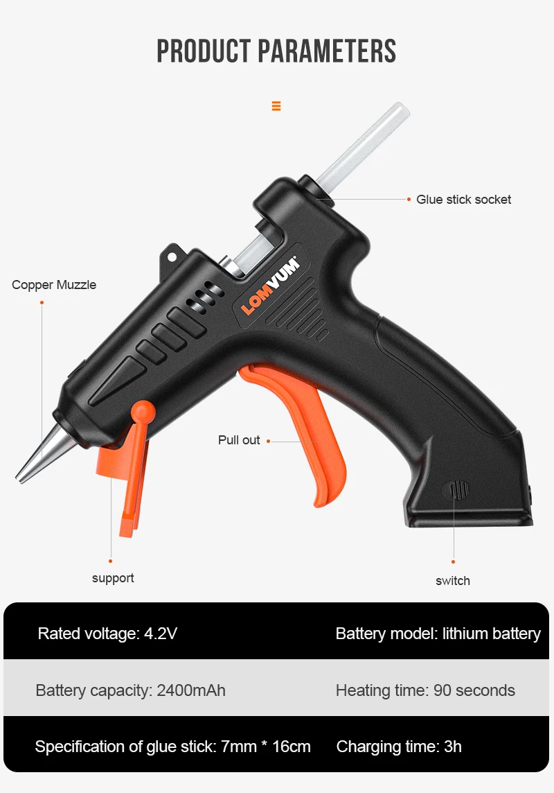Brand Name: LOMVUM Power Source: DC Model Number: black Usage: Home DIY Rated Voltage: 4.2V Nozzle Material: Stainless SteelBattery Capacity: 2400mAh USB: Rechargeable No Plug Needed Charging Time: 3 Hours Prouduct including: 30 glue sticks