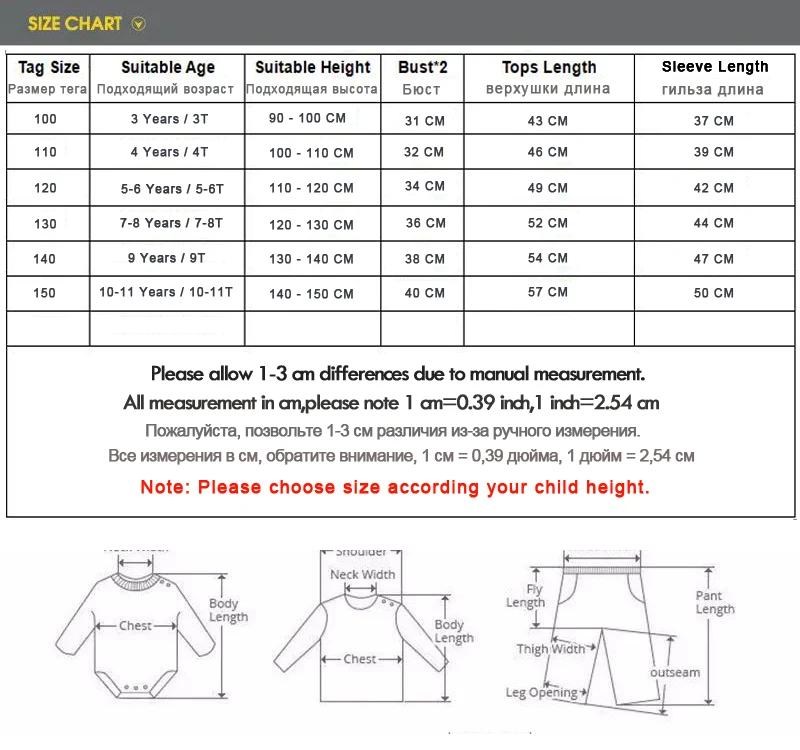 Примечание: Пожалуйста, выберите размер в соответствии с ростом вашего ребенка. Возможны отклонения в 1-3 см вследствие измерений вручную. Все размеры указаны в см, пожалуйста, примите во внимание, что 1 см = 0,39 дюйма, 1 дюйм = 2,54 см |