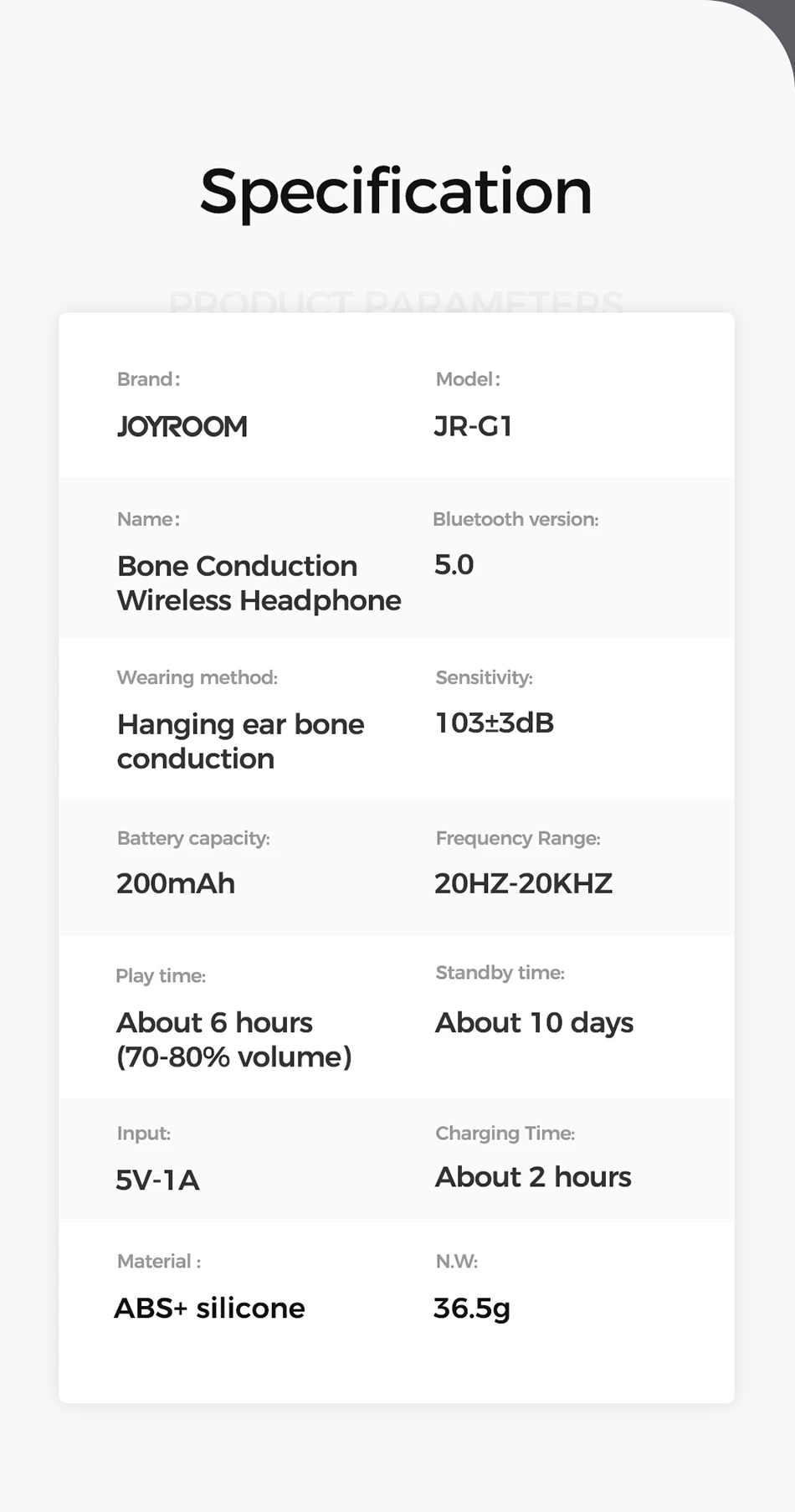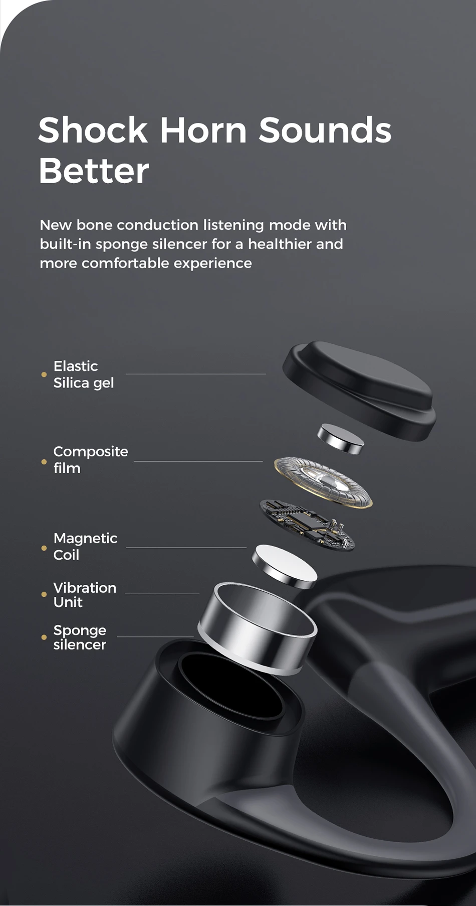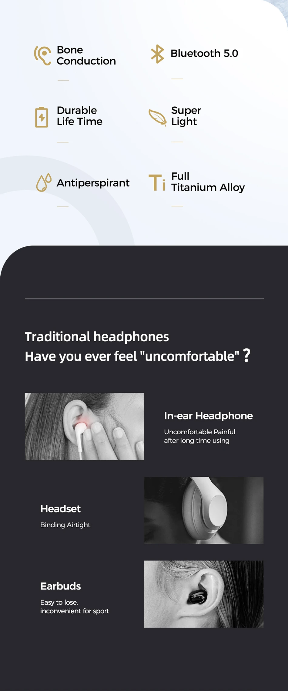 1. Новый режим прослушивания костной проводимости, более здоровый и удобный 2. Предназначен для освобождения ушей и уменьшения повреждения барабанной перепонки 3. Слушайте звуки, Наслаждайтесь музыкой и чувствуйте окружающий мир 4. Выносливость марафона, 6 часов непрерывного прослушивания, 10 дней длительного ожидания 5. Чип управления CSR импортирован из Великобритании, высокая производительность 5,0 bluetooth, быстрое подключение, стабильная, низкое энергопотребление 6. Цельный стальной провод из титанового сплава можно повесить после сгибания на 360 °, что нелегко повредить. Он также используется при ношении очков 7. Компактный и портативный, легко путешествовать 8. Гарнитура для наушников 9. Спортивные беговые наушники