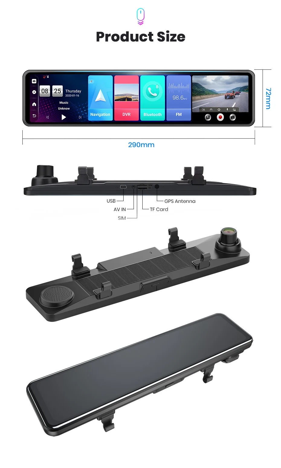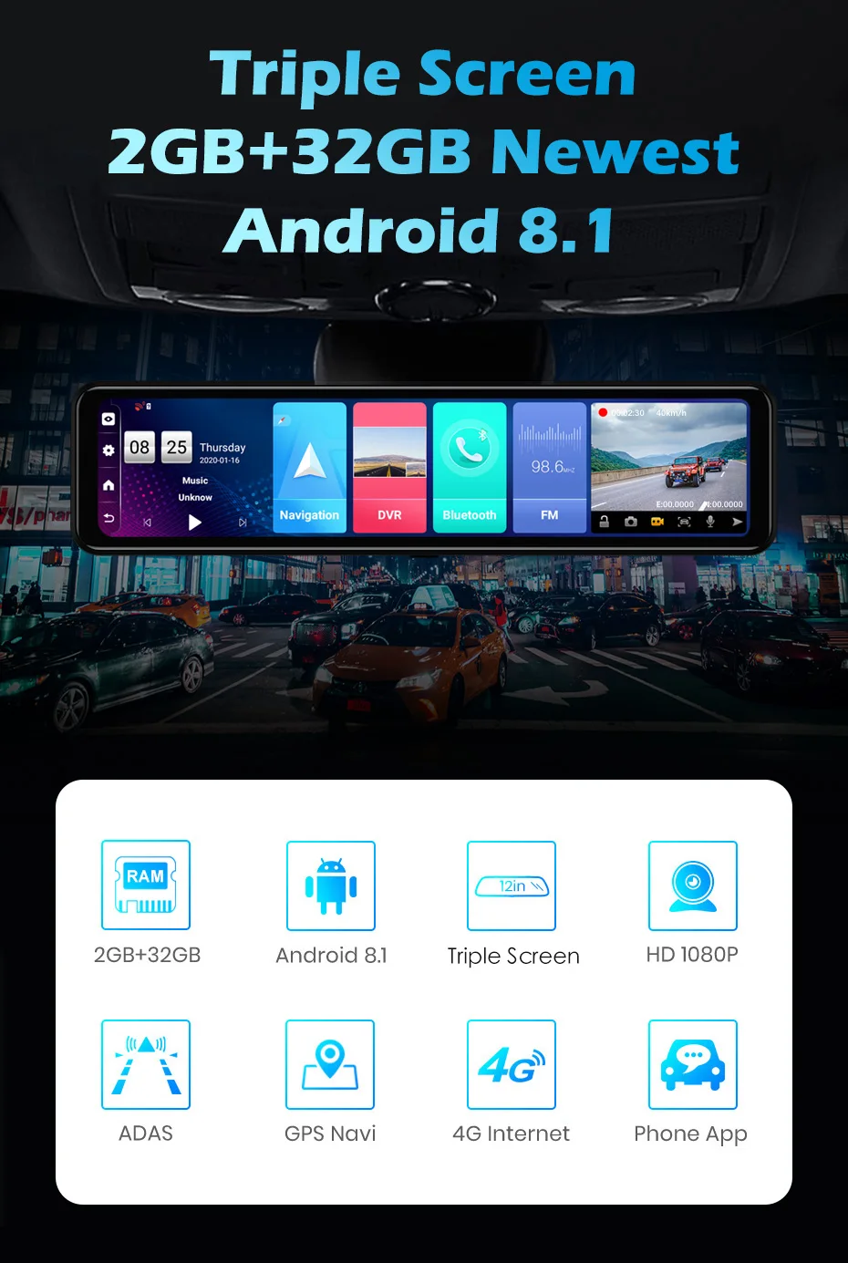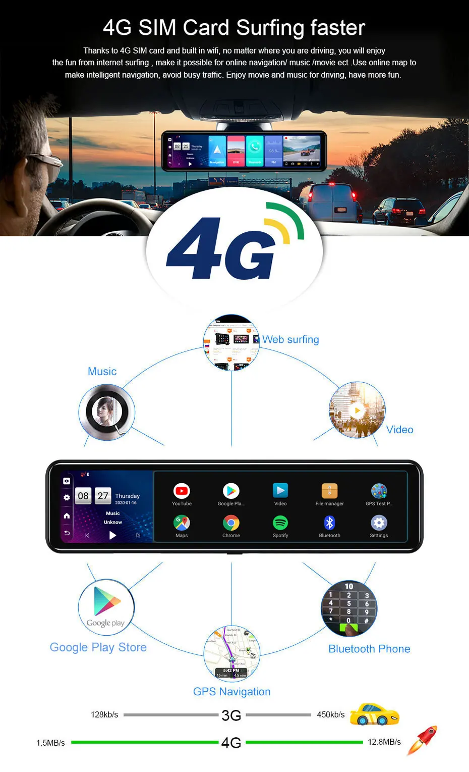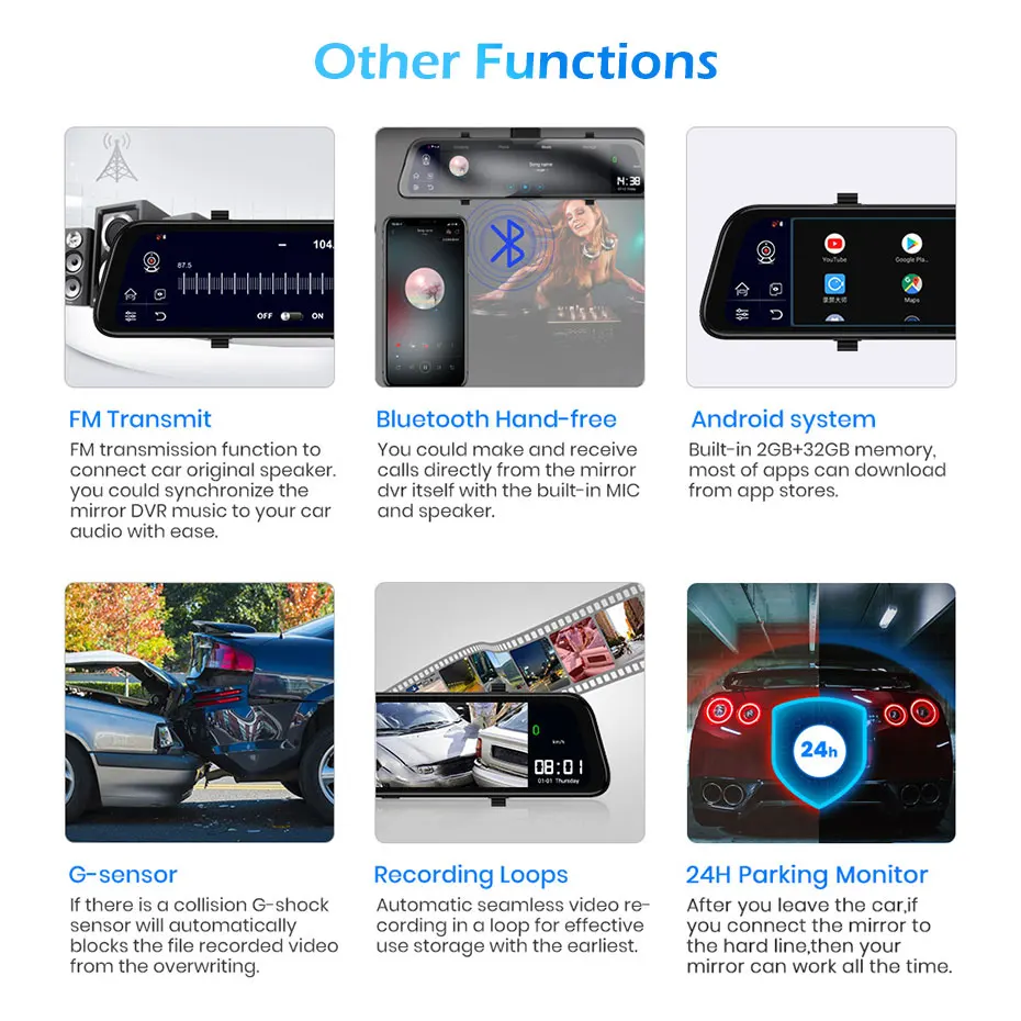 Это Android Stream Media Mirror DVR с двумя объективами -12 дюймов IPS сенсорным экраном 2.5D, Android 8,1 версия, 2G Ram + 32G Rom. -С навигацией GPS Wi-Fi, Bluetooth, FM радио, циклическая запись, g-сенсор, циклическая запись, 24 часа в сутки функции контроля. -И он поддерживает функцию удаленного монитора (приложение carkeeper). -Также вы можете вставить SIM-карту в сеть 4G, тогда вы можете серфинг в Интернете для фильмов и музыки. -Поддержка загрузки и установки приложения googleplay store.