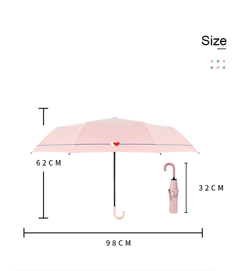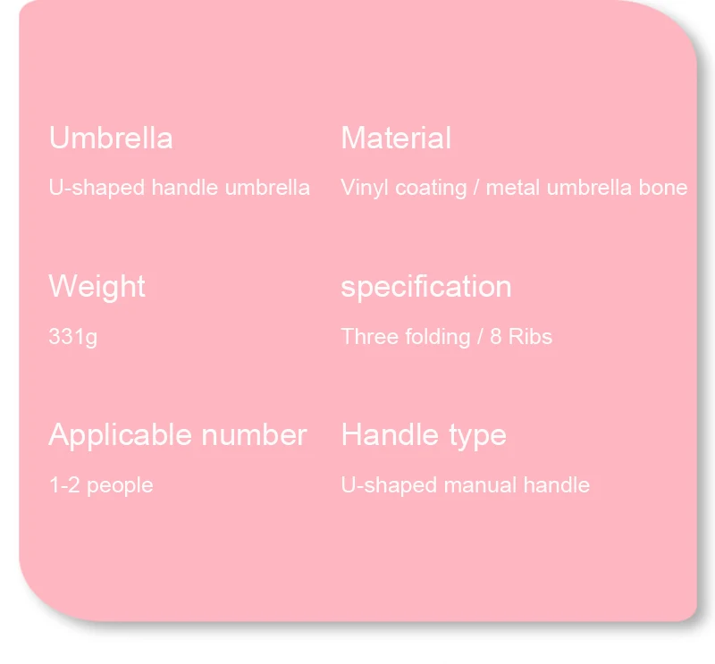 Характеристики: солнцезащитное покрытие L.C.R, степень защиты от ультрафиолета> 99%; Компактный и портативный; Прочная стойка для зонта, эффективная ветронепроницаемость; Водонепроницаемая ткань для зонта, лучше защищает вашего любовника; U-образная ручка