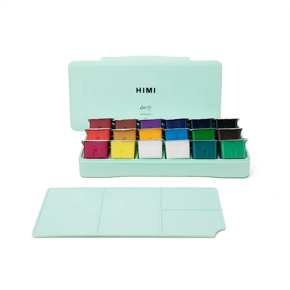 Deep Red, Ochre, Violet, Ultramarine, Prussian Blue, Black, Ponceau, Earth Yellow, Midlum Yellow, Acid Blue,Grass Green, Burnt Umber, Rose, Lemon Yellow, Titanium White, White, Jade Green, Pale Green