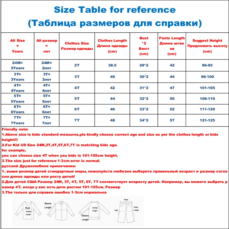 Бренды: воротник сорочки из одной детали Материалы: хлопок Количество: 1 комплект (1 футболка + 1 штаны) Возраст: 2-7 лет Размер: 24M-3T-4T-5T-6T-7T Сезон костюма: лето