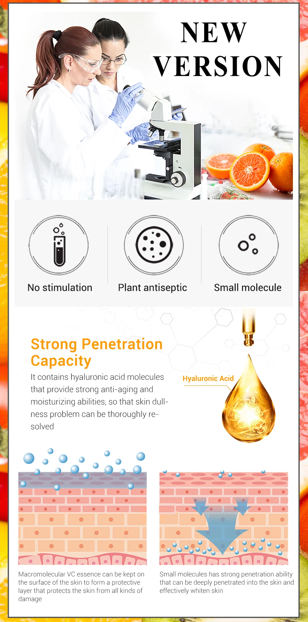 Содержит высокую активность мелкомолекулы витамина С, с антиоксидантной защитой, этот продукт может предотвратить образование меланина. Также с такими функциями, как отбеливание и осветление цвета кожи, удаление пятен и меланина, он может восстановить здоровье кожи, способствовать метаболизму кожи и активировать поврежденные клетки кожи, чтобы восстановить эластичность.См. также другие товары: 8884001094279440, 8884001094279441, 8884001094279443, 8884001094279444