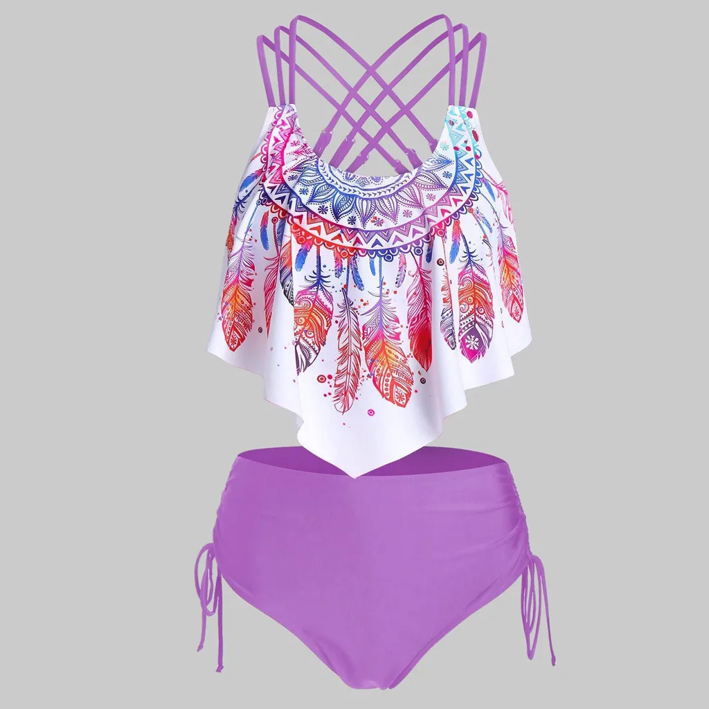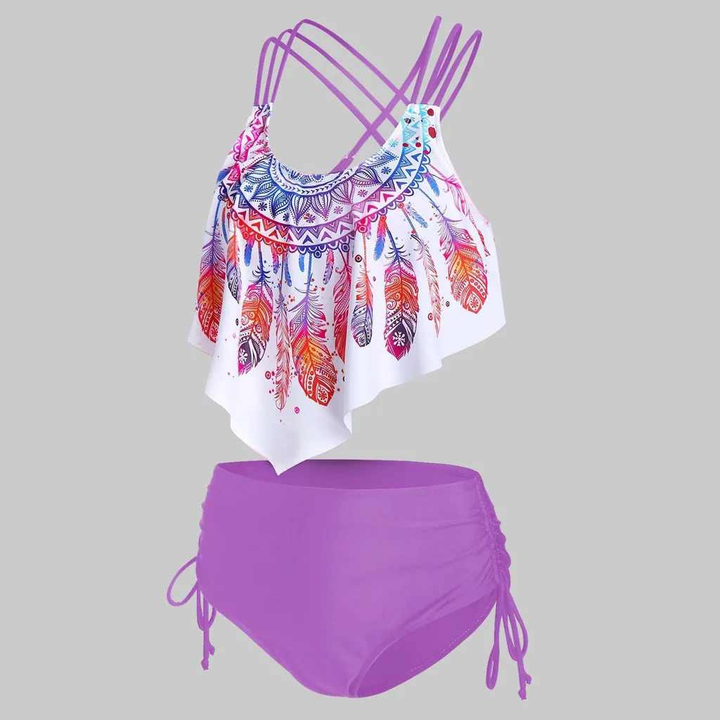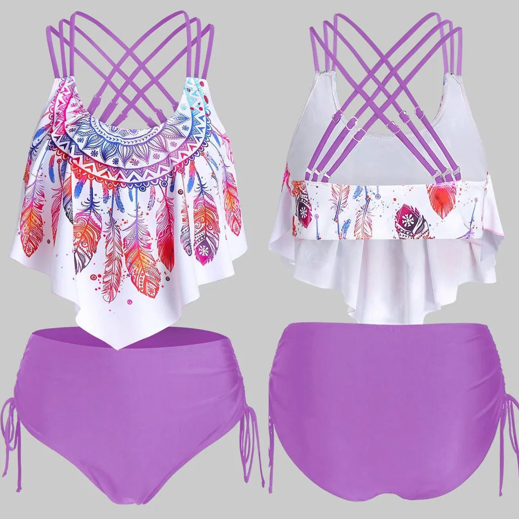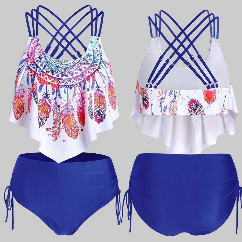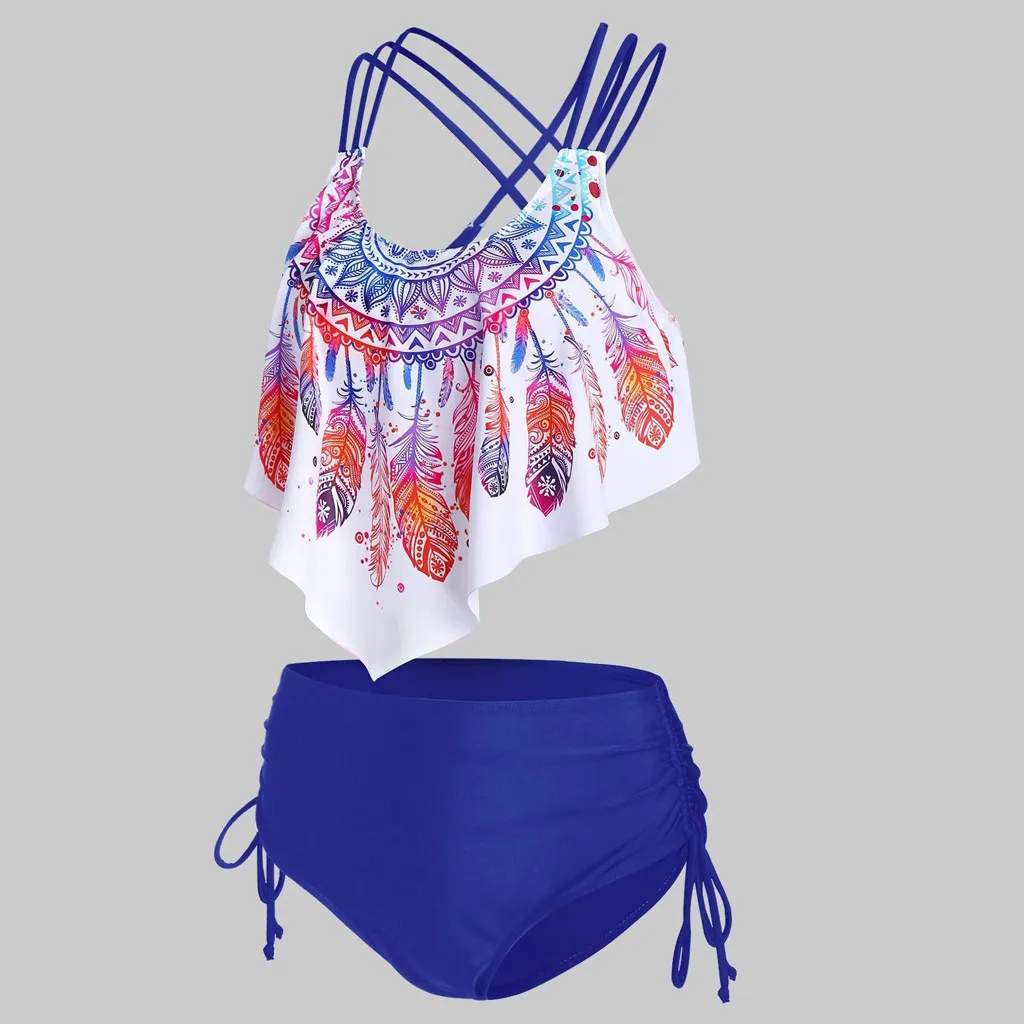 Женский купальник-танкини с принтом перьев пуш-ап с подкладкой и оборками
